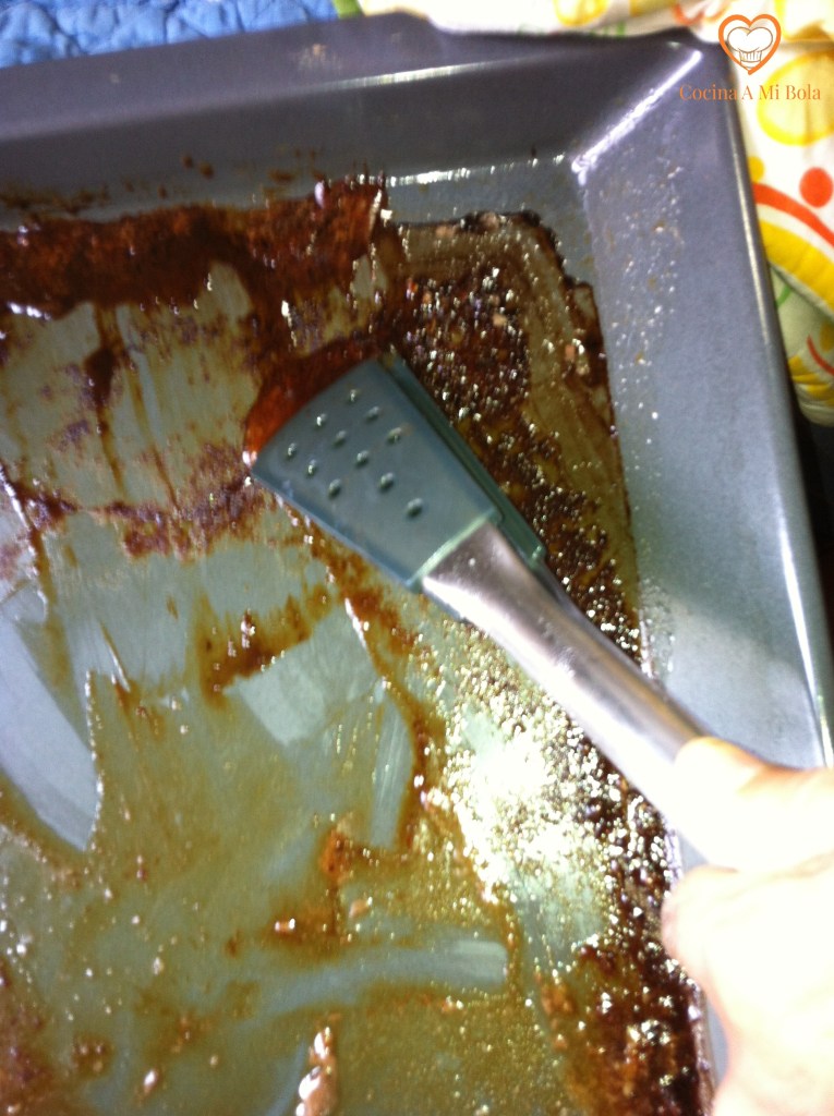 SÉPTIMO.- Cuando la carne alcance la citada temperatura interior de 45ºC estaremos ya en alerta, y si vemos que sube rápido, la sacaremos del horno. Si pensamos que aún puede estar un ratillo más (y esto es intuitivo), aguántala hasta los 50ºC. Veremos que estará ya doradita por fuera. Apagamos el horno, sacamos la bandeja y echamos todo el jugo en la sartén de la cebolla, aprovechando bien todo el poso adherido a la bandeja.