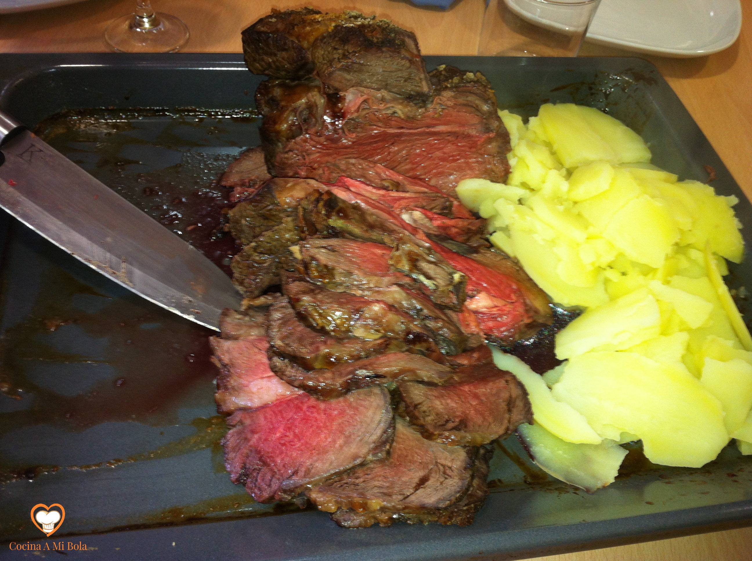 NOVENO.- Cuando la salsa haya reducido un tercio (muy aproximadamente) de lo que había, apagamos. Trinchamos la carne (ya reposada) en lonchas no muy gruesas y servimos con la salsa y una patatas… o sin ellas. Esta carne está excelente del tiempo o fría al día siguiente. Y en bocadillo, con su salsa, ni te cuento!!. Asado sin