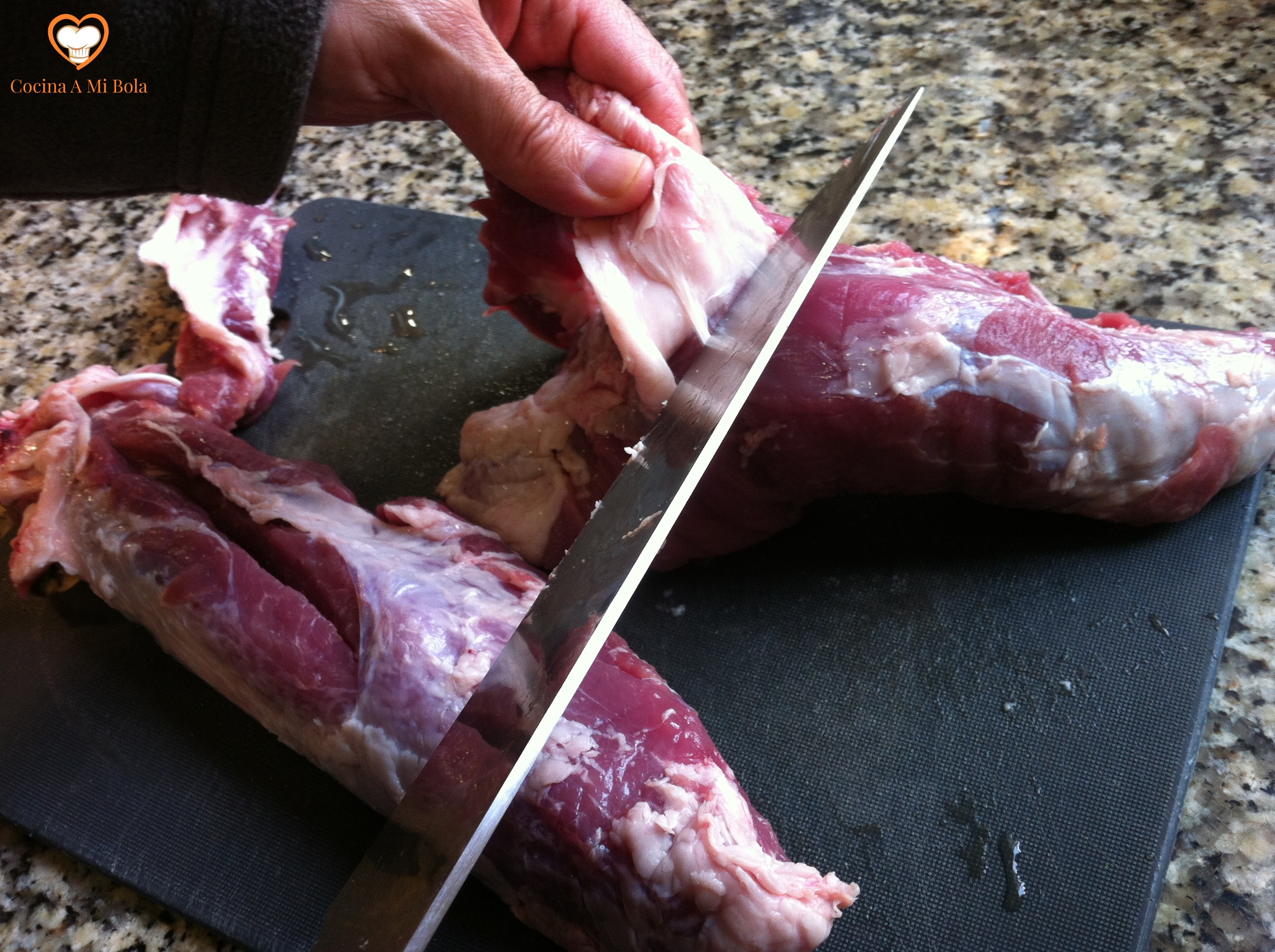 SEGUNDO.- Con un cuchillo afilado eliminaremos las partes blancas de grasa. El solomillo es una pieza magra de carne y extremadamente tierna, pero las adiposidades y ciertas fibras blancas algo más tersas que la rodean pueden darnos la impresión de estar comiendo una carne más dura, así que es mejor limpiarla.