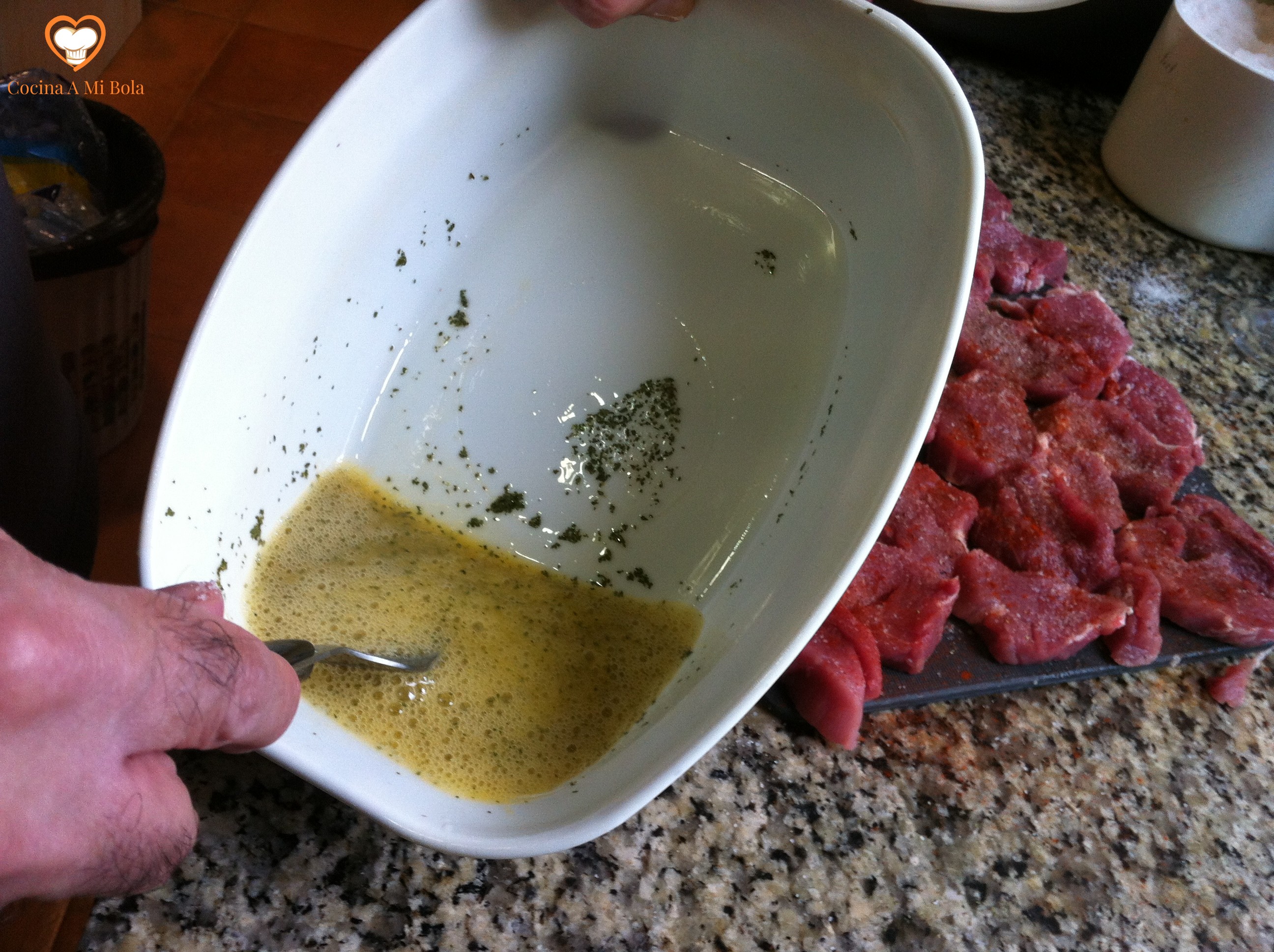 QUINTO.- Batiremos el huevo en un bol con algo de sal y el resto del majado de ajo y perejil, e iremos incorporando los medallones de carne mezclándolos con un tenedor de forma que todos se impregnen.