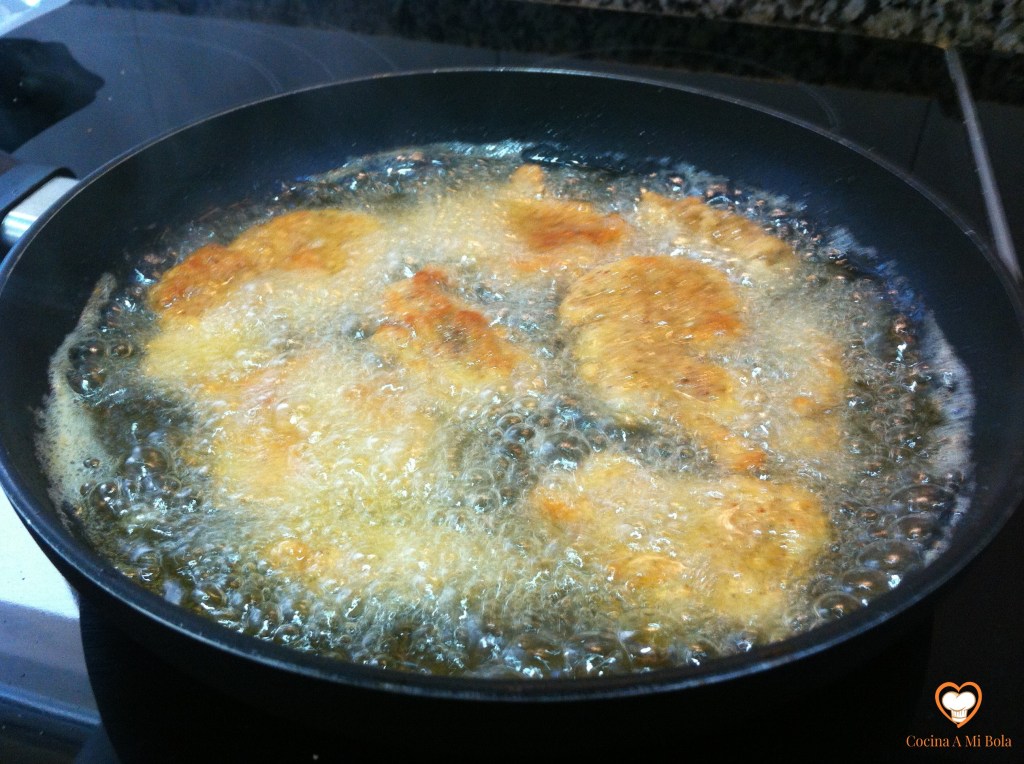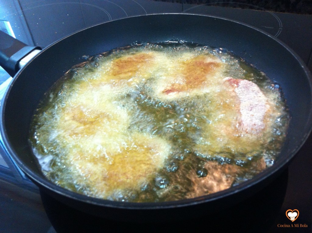 SÉPTIMO.- Freír en abundante aceite de oliva a temperatura media. IMPORTANTE: Usa aceite nuevo para evitar posible contaminaciones cruzadas de gluten procedente de frituras previas. Debe hacerse por dentro pero no queremos que se queme la cobertura de pan, así que hemos de procurar un fuego vivo pero no muy intenso. En cuanto veas que toma un cierto tono dorado, dalos la vuelta, pero no los vayas a secar. Buscamos un color interior rosáceo.