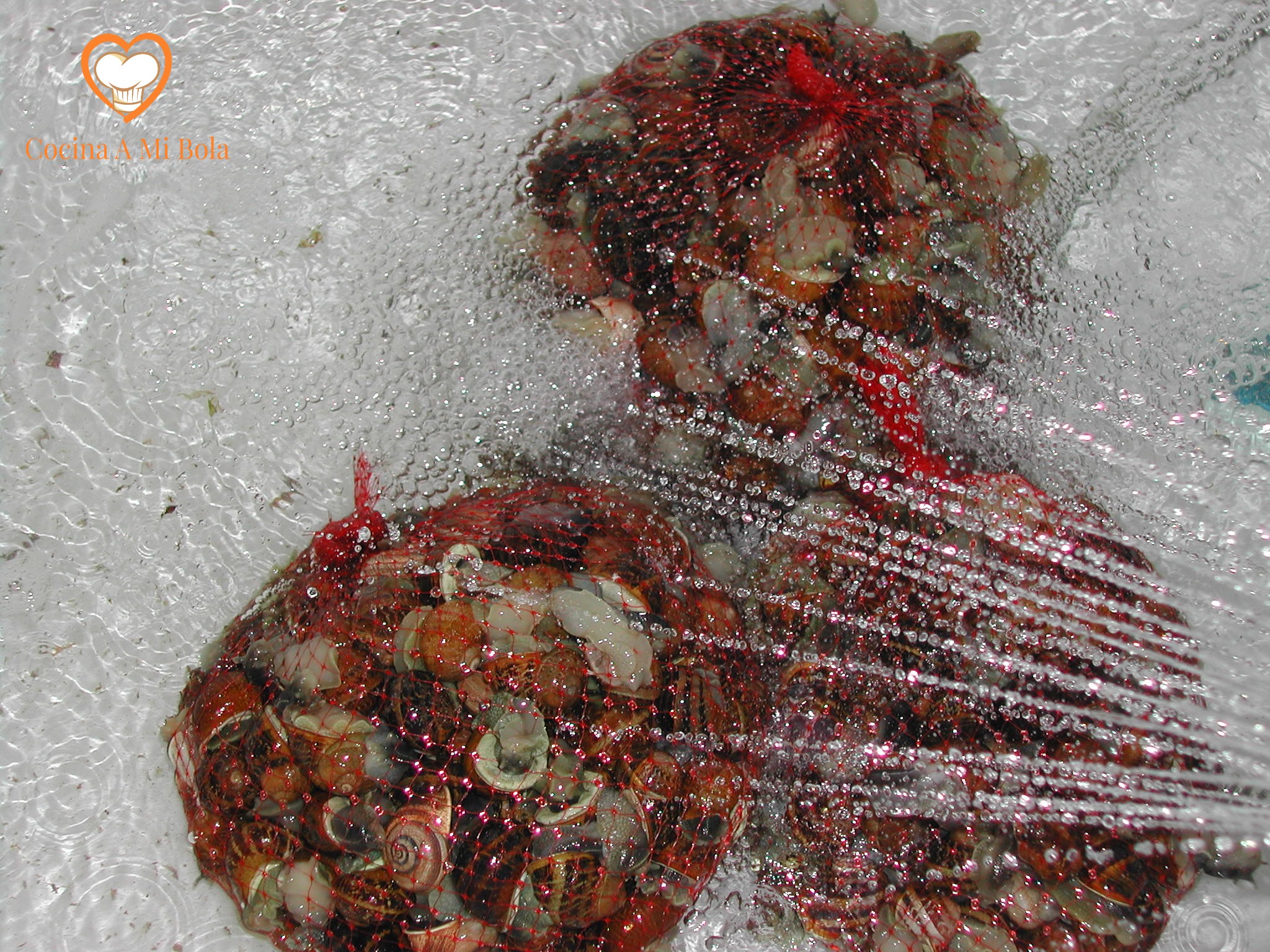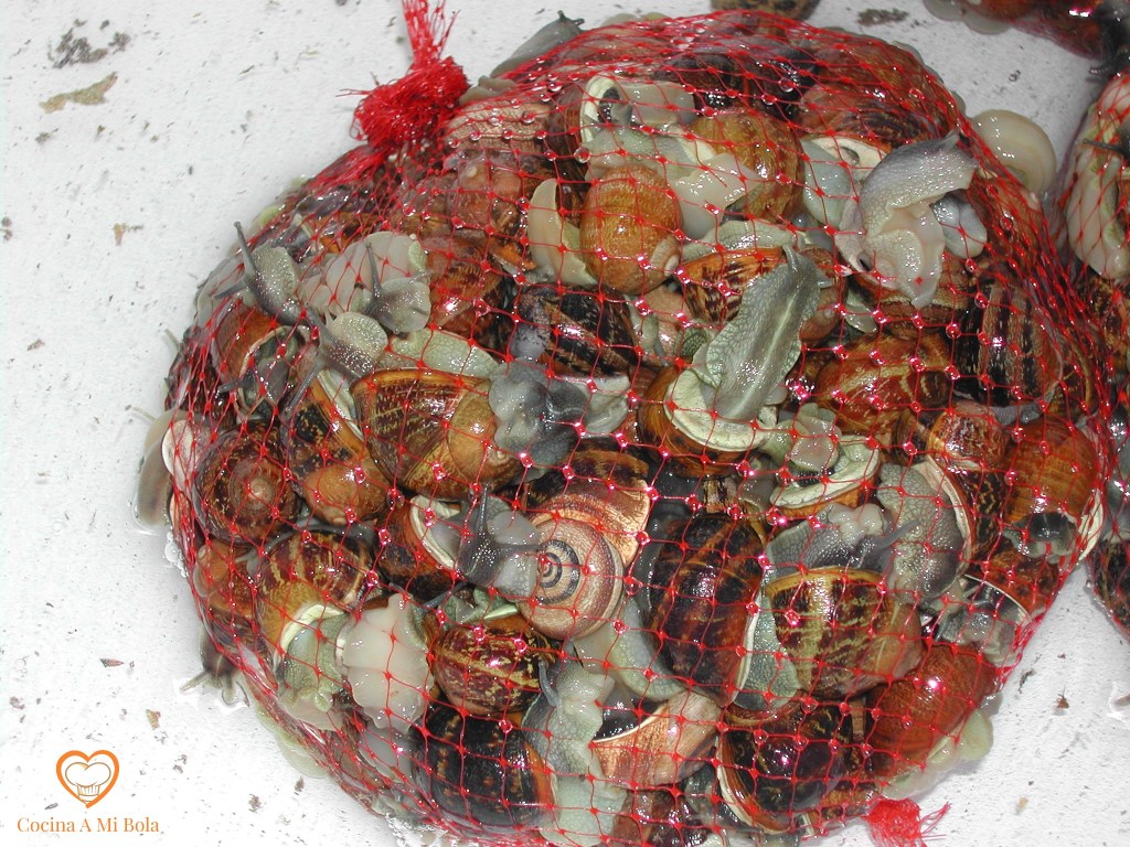 PREVIO.-  Encontraremos los caracoles en los mercados en sus mejores épocas (otoño y primavera), usualmente envasados en mallas cerradas. Suelen estar ya ayunados pero de no ser así, habría que tenerlos en un barreño tapado (o con una malla) durante, al menos ocho días que es el tiempo que pueden permanecer vivos sin comer.