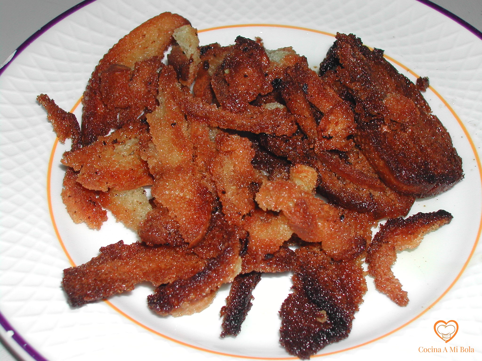 TERCERO.-  Se fríen las rebanadas de pan, que estarán cortadas no demasiado gruesas, en aceite de oliva muy caliente. Una vez fritas -sin que se quemen-  se sacan de la fuente (a poder ser, de barro) y se reservan.