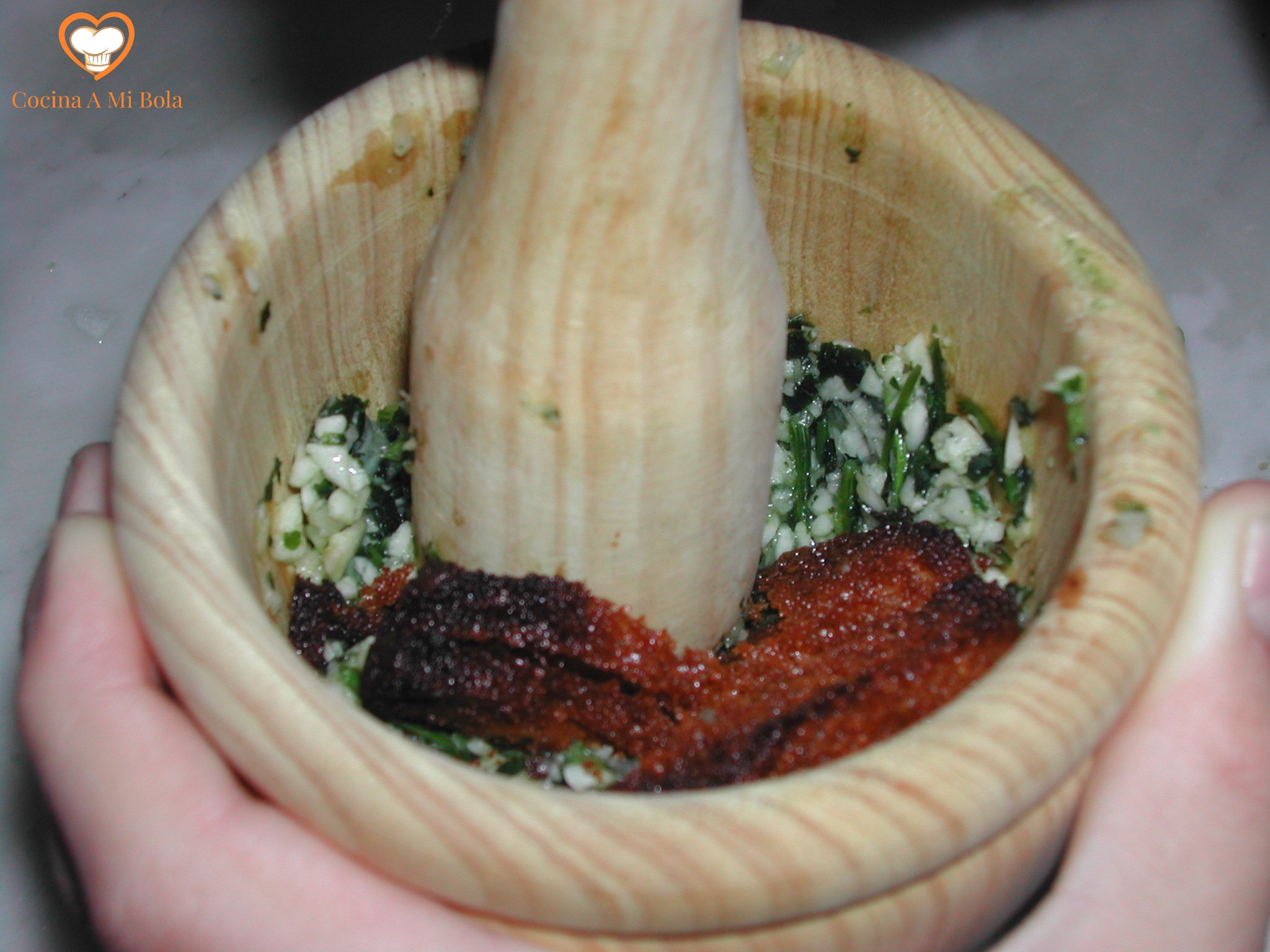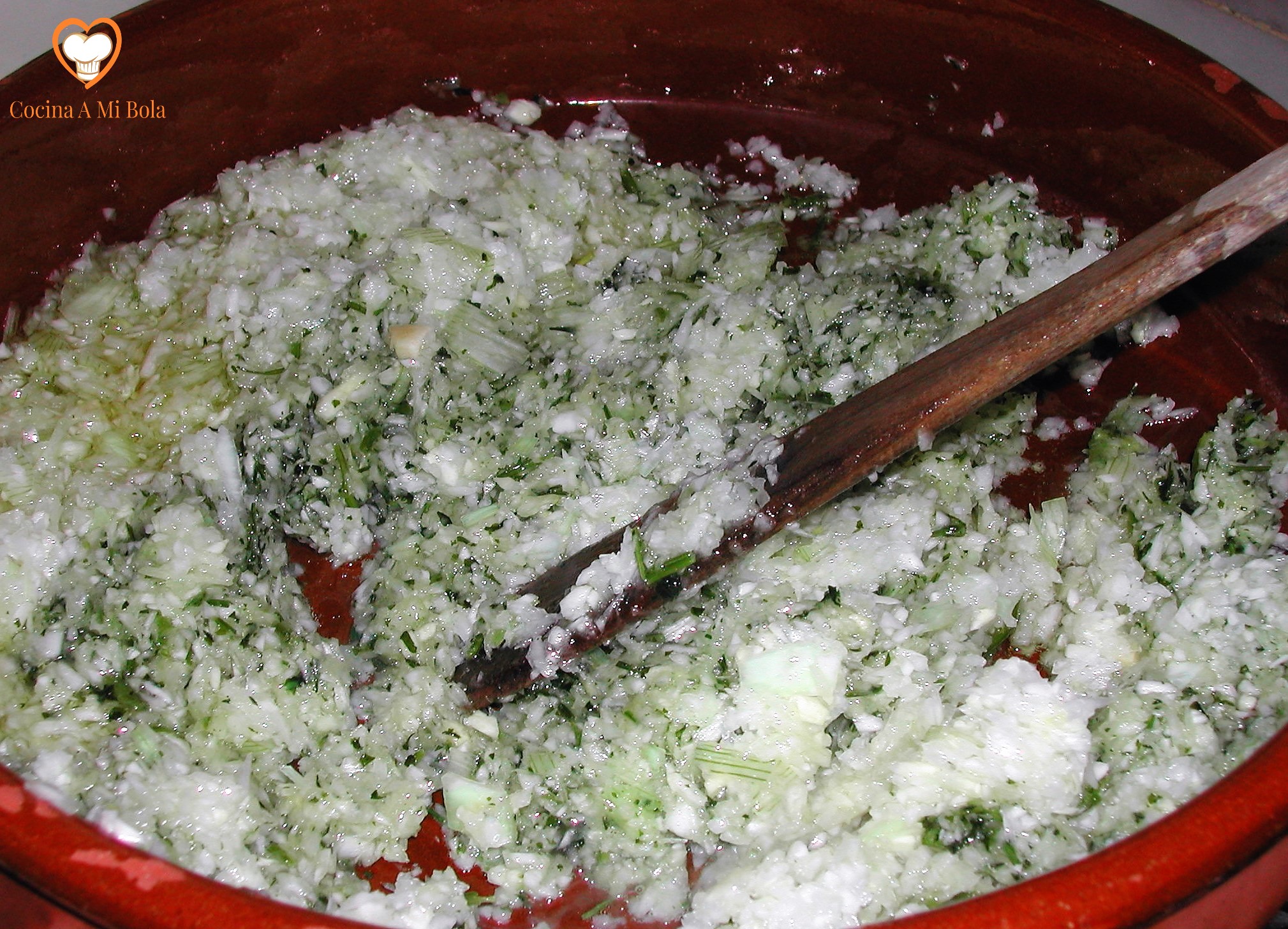 CUARTO.-  Se sofríe la cebolla bien picada. Mientras tanto,  se pica bien el perejil y se echa todo en el mortero con el ajo y unas pizcas de sal para que no resbale. Majar bien y añadir el pan frito machacándolo ligeramente con la mano del mortero. Una vez hecho esto, se añade todo al sofrito junto con el laurel y la cayena. Remover.