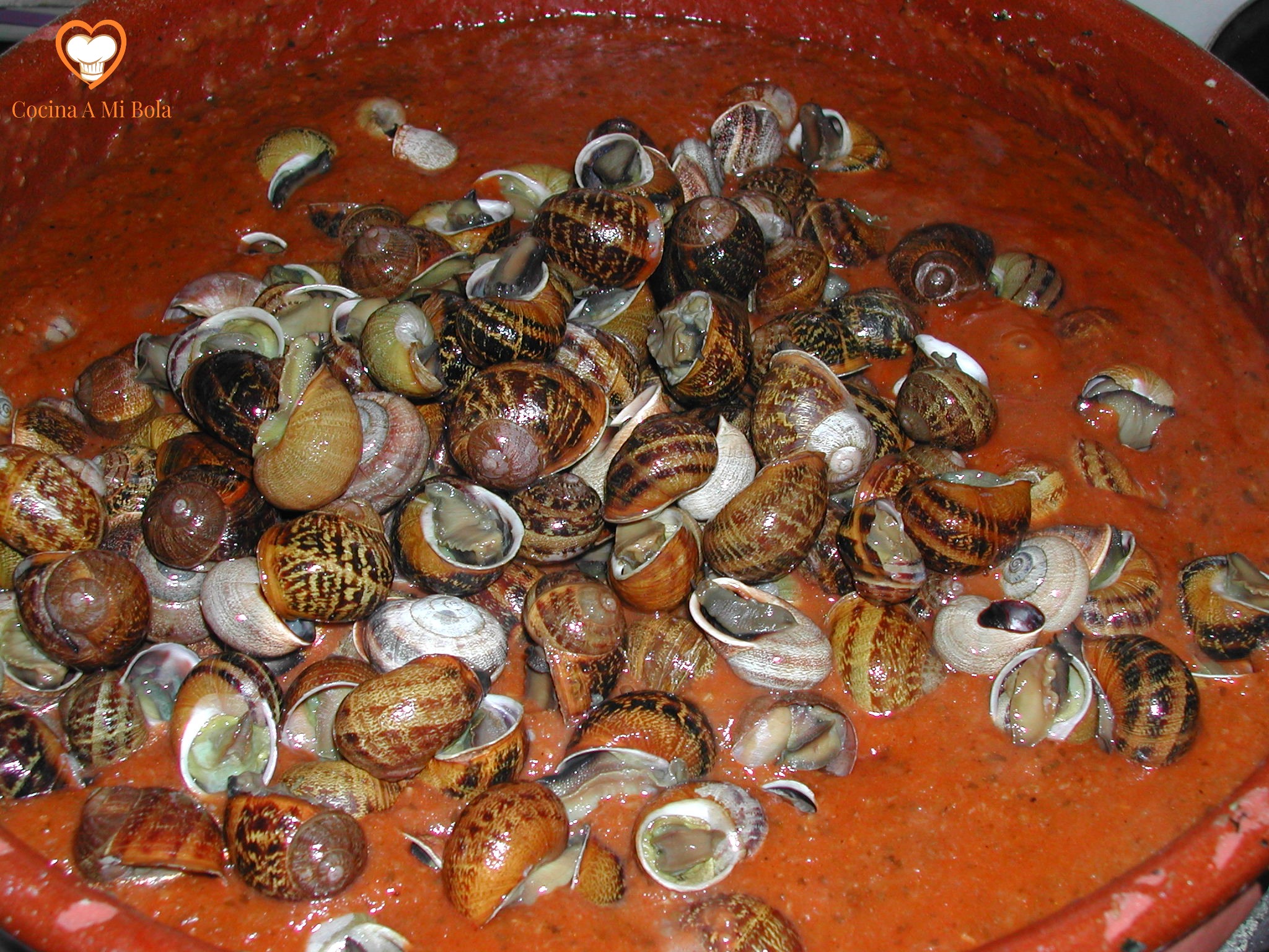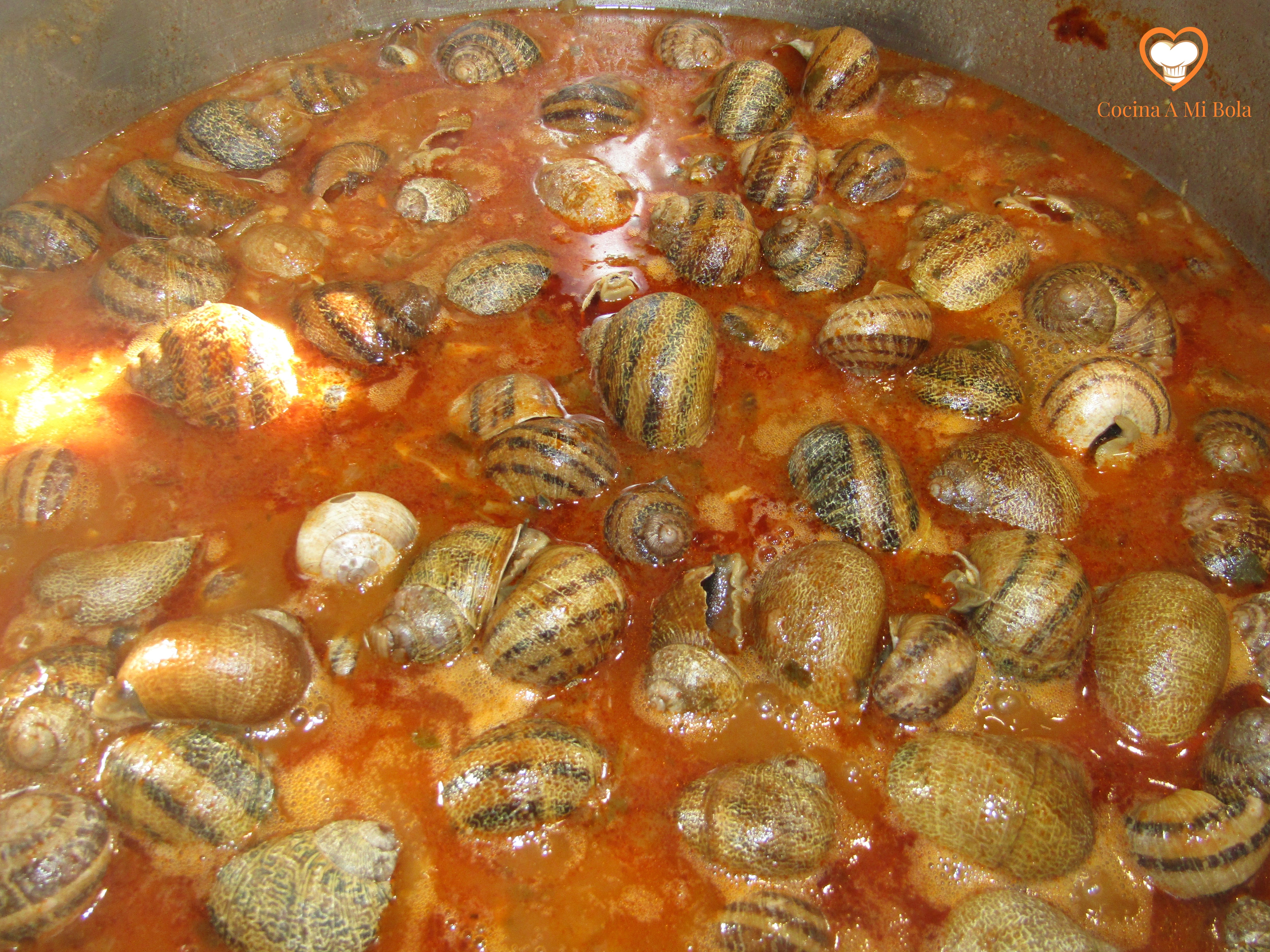 OCTAVO.- Dejar cocer a fuego muy lento unas dos horas removiendo de vez en cuando y con extremo cuidado para no golpear las conchas de los caracoles ya que, tras la cocción, estarán muy reblandecidas y se corre el riesgo de llenar el guiso de pequeños trozos de concha que resultarán muy desagradables al comerlos.