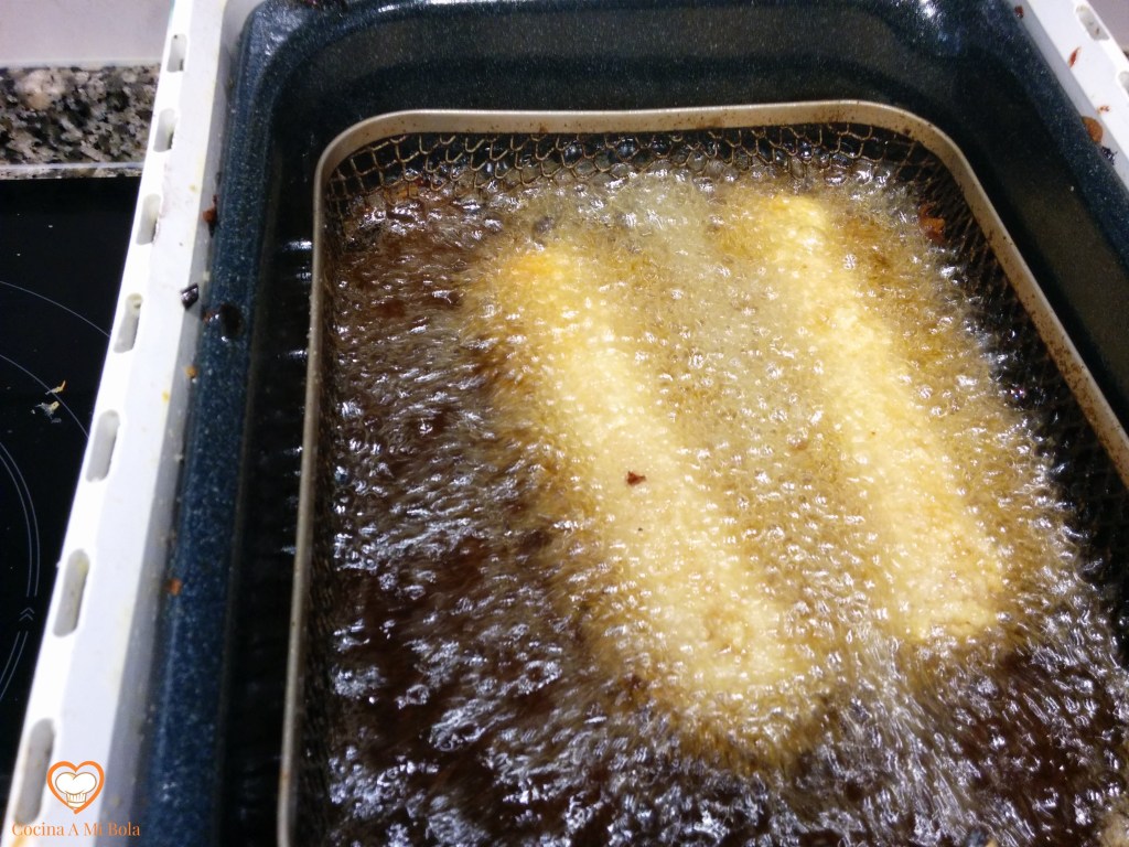NOVENO.- Fríelos en abundante aceite de oliva MUY CALIENTE. Hay que estar muy pendiente para que no se nos salga el queso ya fundido del interior y porque se doran enseguida.