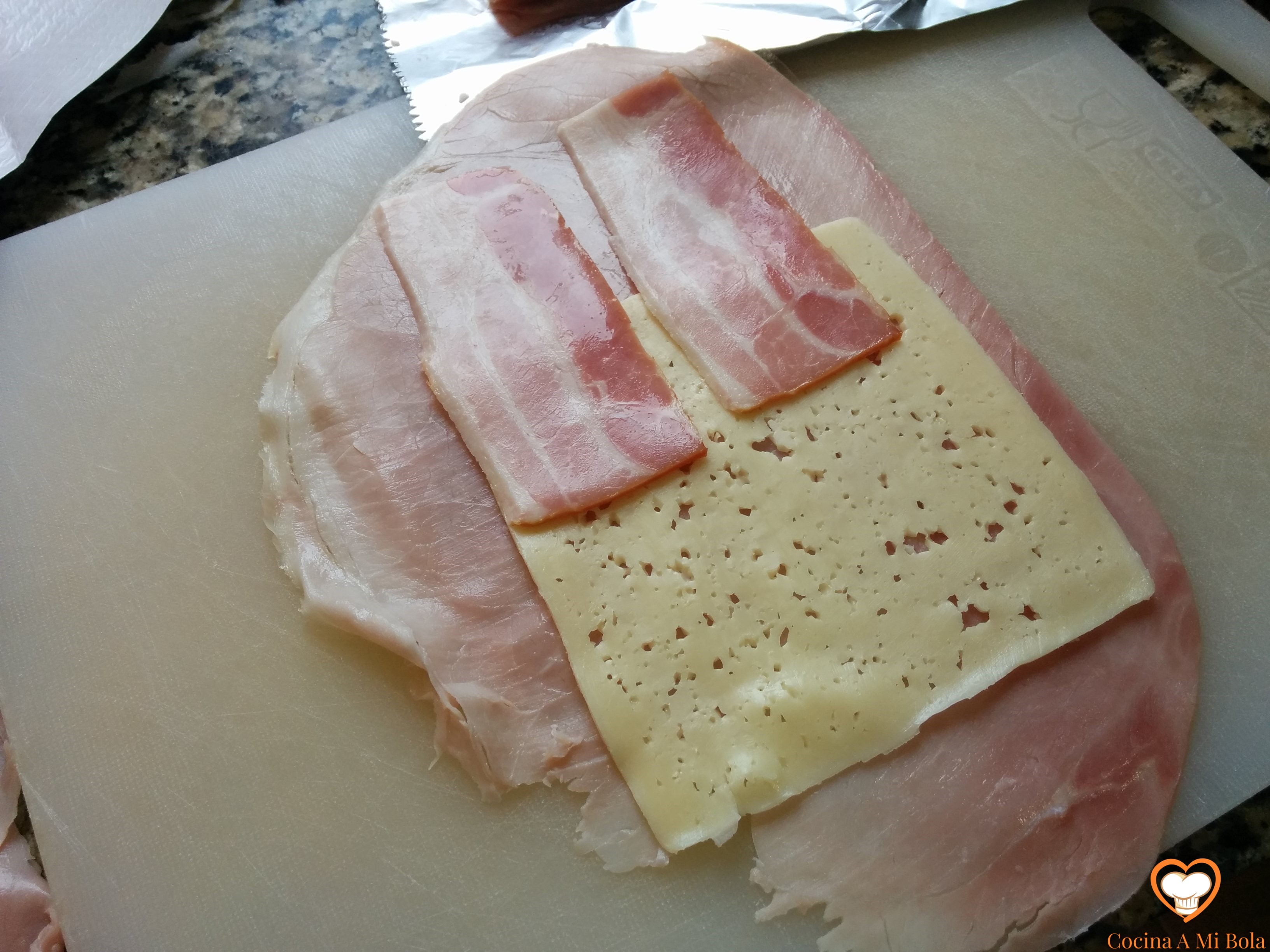 TERCERO.- En medio de la loncha de jamón colocaremos la de queso y sobre ésta, pondremos la de bacon cortada en dos, una a cada extremo. (Yo le quito toda la grasa que puedo).