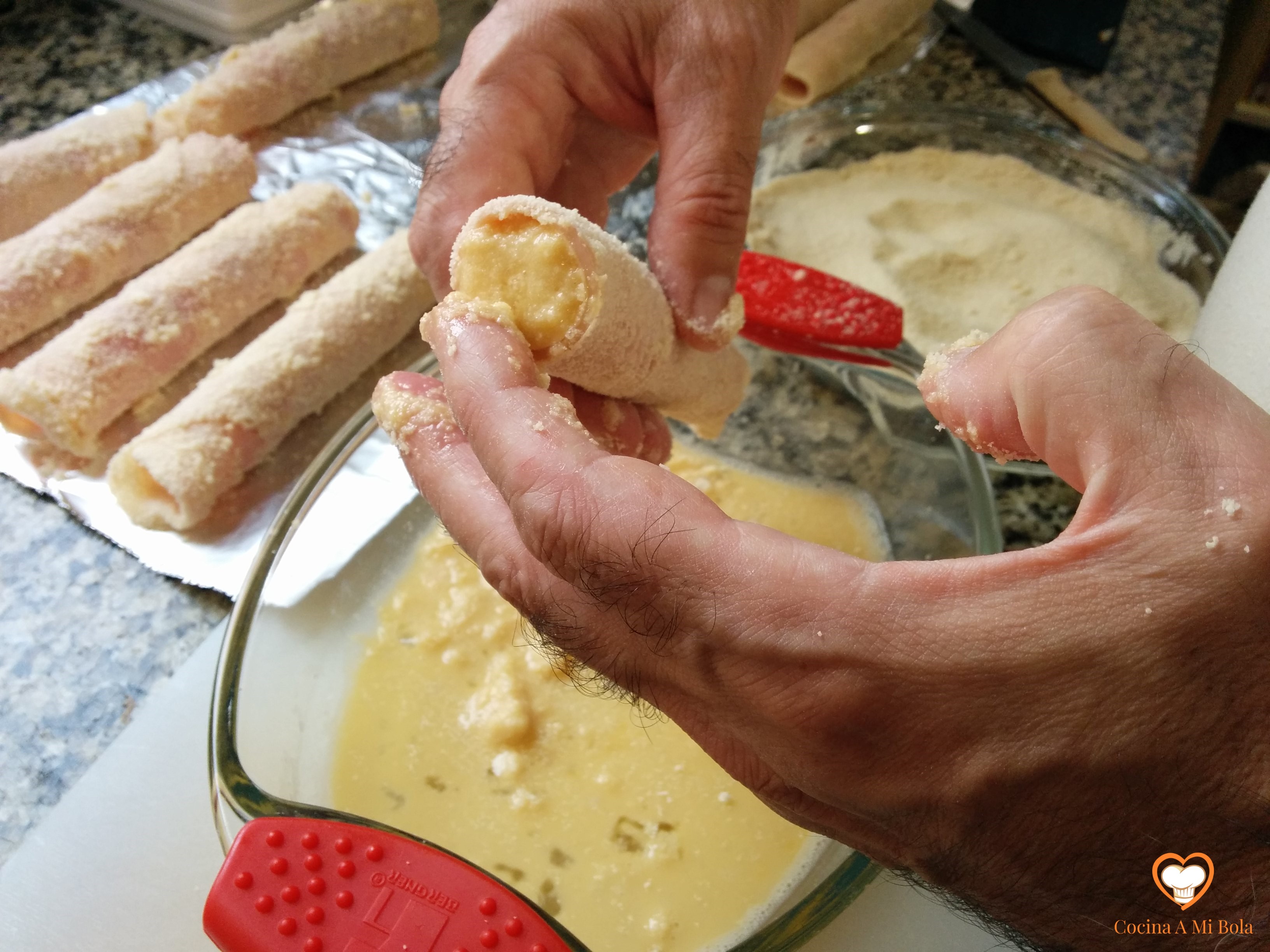 QUINTO.- Tomamos cada rollito y lo pasamos por huevo y por pan rallado con mucho cuidado para que no se nos desenrolle y los vamos colocando sobre una bandeja sobre la que habremos espolvoreado más pan rallado.
