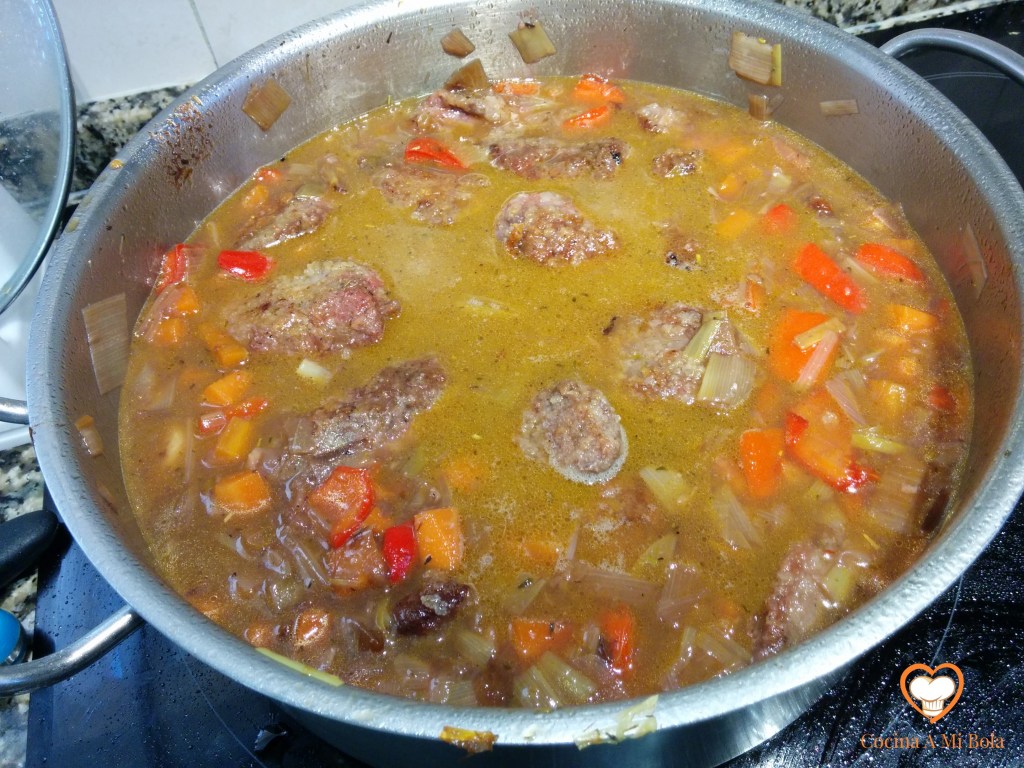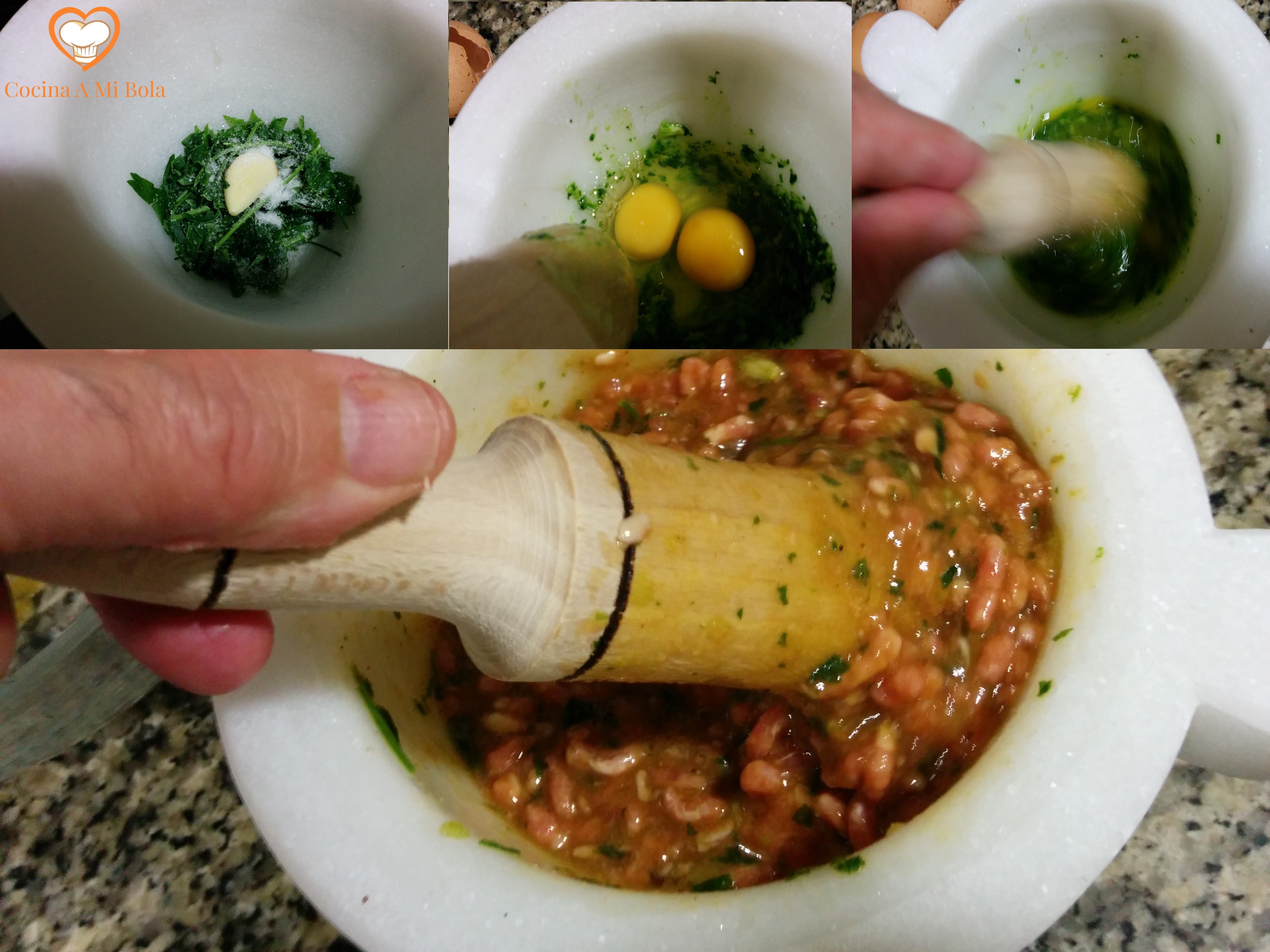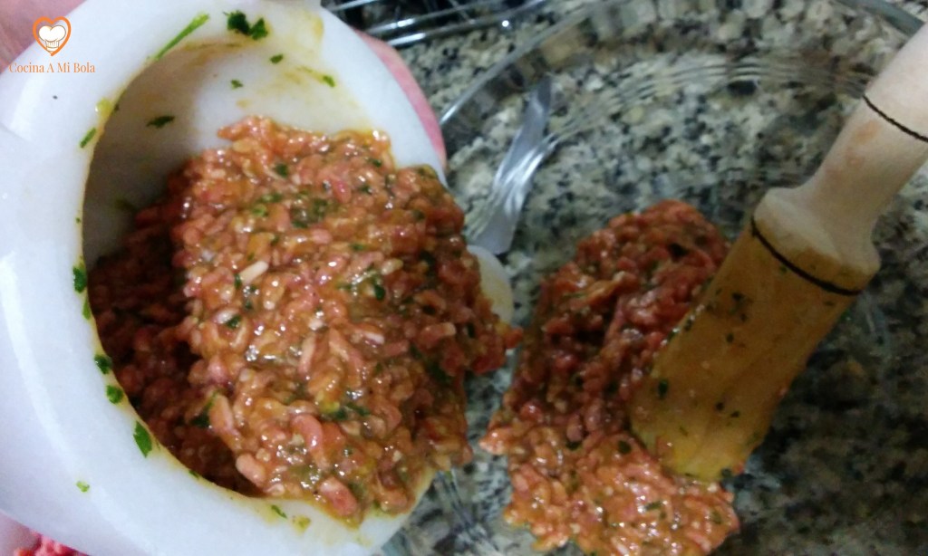 TERCERO.- Ahora vamos añadiendo todos los ingredientes menos la carne y el pan rallado, y mezclamos todo bien. Aviso: cuidado con los líquidos; pon poquísima cantidad porque te quedaría una masa tan blanda que te impediría su manipulación. Ve añadiendo la carne poco a poco y mezclándolo bien con el aliño hasta haberla echado toda. Si tienes tiempo, déjalo macerar en el frigorífico un par de horas como mínimo, pero si no, continúa.