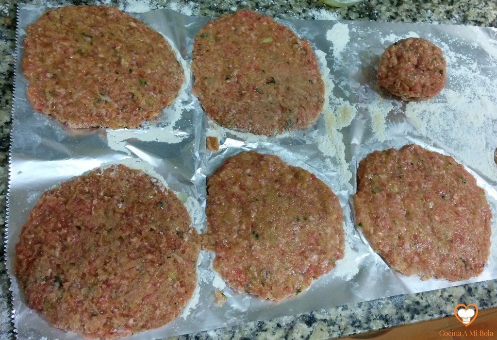 QUINTO.- Ahora extiende papel de aluminio sobre la encimera y espolvorea sobre él un poco de harina para que la carne no se pegue. Embadúrnate las manos con un poco de aceite de oliva para manipular la carne con más facilidad y haz bolas de tamaño uniforme, aplastándolas sobre el papel dándole a los filetes forma redonda.