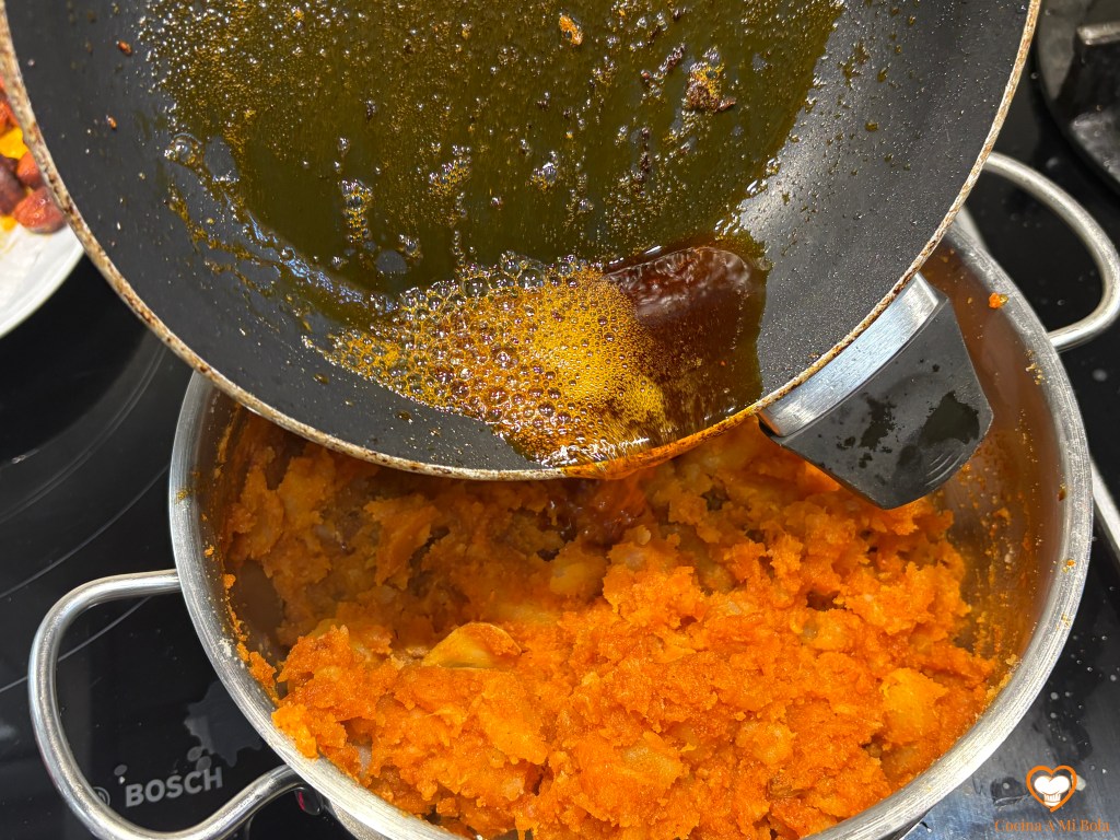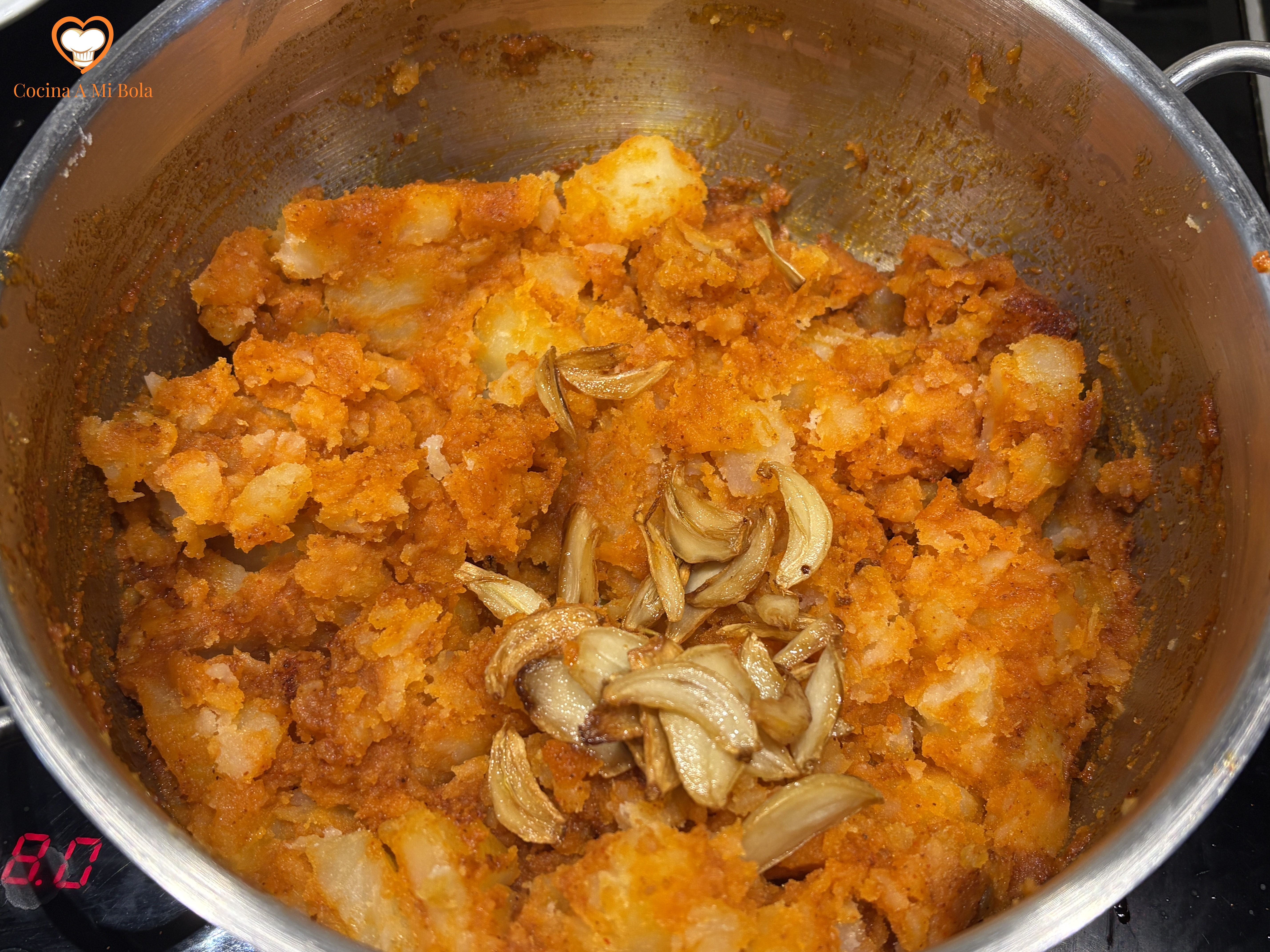 SEGUNDO.- Si tu mortero es grande, sigue con él, y si no, échalo en un bol de cristal con fondo ovalado que, al no tener esquinas ni ángulos, se remueve y mezcla mejor. Echa los huevos y remueve bien hasta que todo haga cuerpo.
