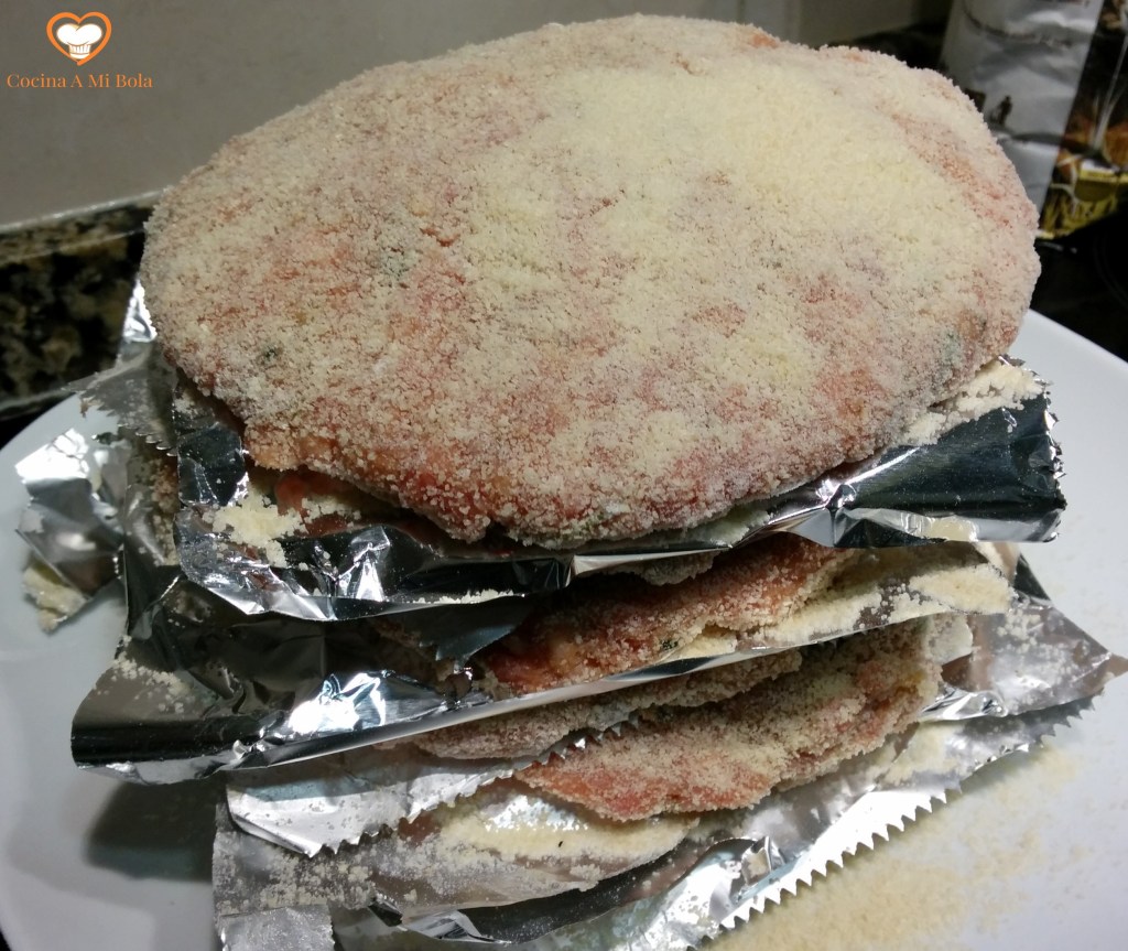 SÉPTIMO.- Toma cada filete, de uno en uno; quítale el papel y échalo en el plato de pan rallado. Rebózalos bien, sacude el exceso y colócalos en un plato uno encima de otro, poniendo entre cada uno el papel de aluminio que acabamos de quitar. Evidentemente, esto no es preciso, pero es una buena técnica de manipulación que nos hará el trabajo más fácil y desde luego es óptima si queremos reservarlos para hacerlos más tarde, al día siguiente, o incluso congelarlos.