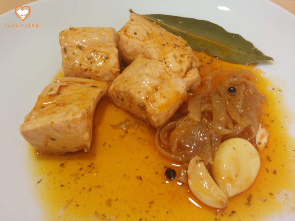 INGREDIENTES: 1 salmón de 1,8 – 2 kg, 3 cebollas, 10 dientes de ajo, 4 hojas de laurel, 330 cc aceite de oliva virgen extra, 150 cc vinagre de jerez, 200 cc vinagre de manzana, 15 granos de pimienta negra, 1 cucharada de sal gruesa, 1 cucharada de pimentón murciano, perejil picado, tomillo, romero, 1 clavo.