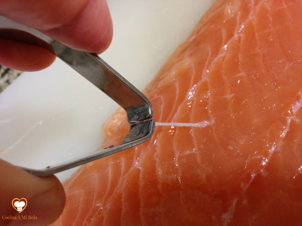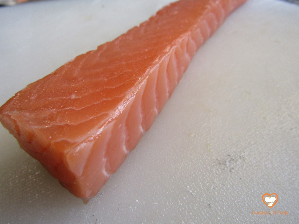 PRIMERO.- Compra un salmón entero de unos dos kilos. Pídele al pescadero que le quite la espina central, escama, vísceras y la piel. No obstante, tampoco es muy complicado si lo haces tú mismo, siempre que tengas un cuchillo adecuado y bien afilado. Hay otra serie de espinas que se alojan en la zona de la ventresca y en los laterales del lomo que también debemos retirar.