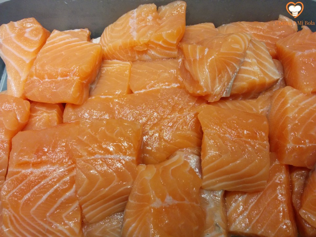 QUINTO.- Mientras se hacen la cebolla y los ajos, puedes ir cortando el pescado en tacos no muy grandes. Mira la foto. Sálalos ligeramente por todos lados y reserva.