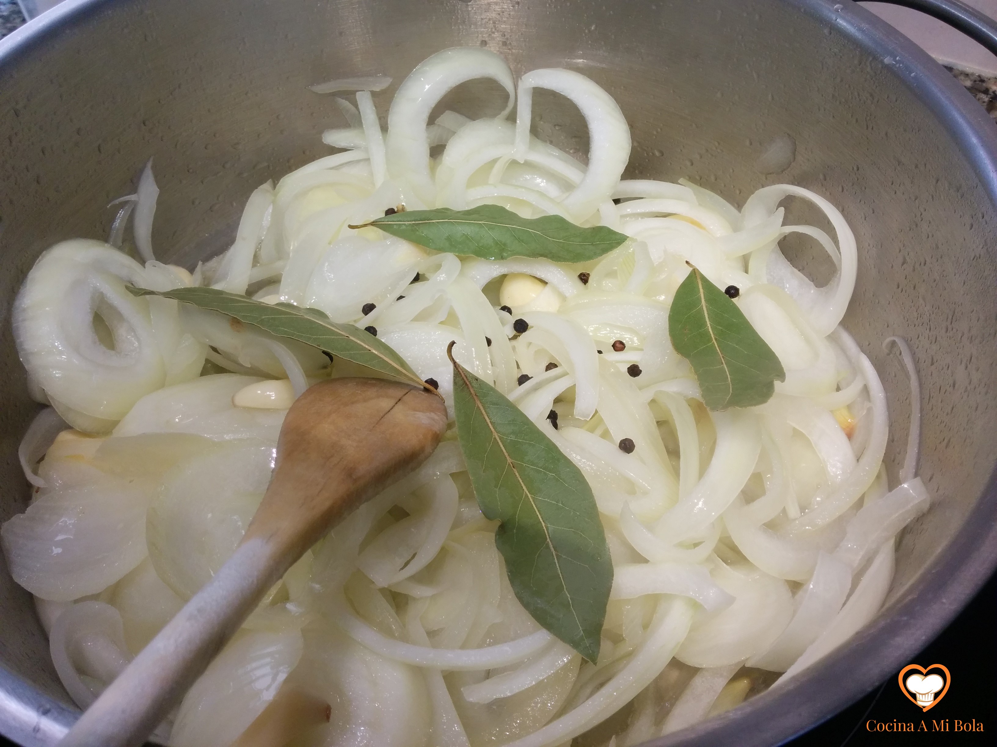 TERCERO.- Pela las cebollas y córtalas en juliana o e aros; da igual, pero que no sean cortes muy finos, sino más bien gruesos. Ponlo a rehogar con un tercio del aceite de oliva virgen extra y cuatro hojas de laurel en una cazuela de fondo amplio para que luego nos quepa el pescado. Fuego fuerte al principio y removiendo para que todo se impregne bien del aceite. Enseguida lo ponemos a medio gas removiendo de vez en cuando. No pretendemos que se tueste, sino que se cocine despacio.