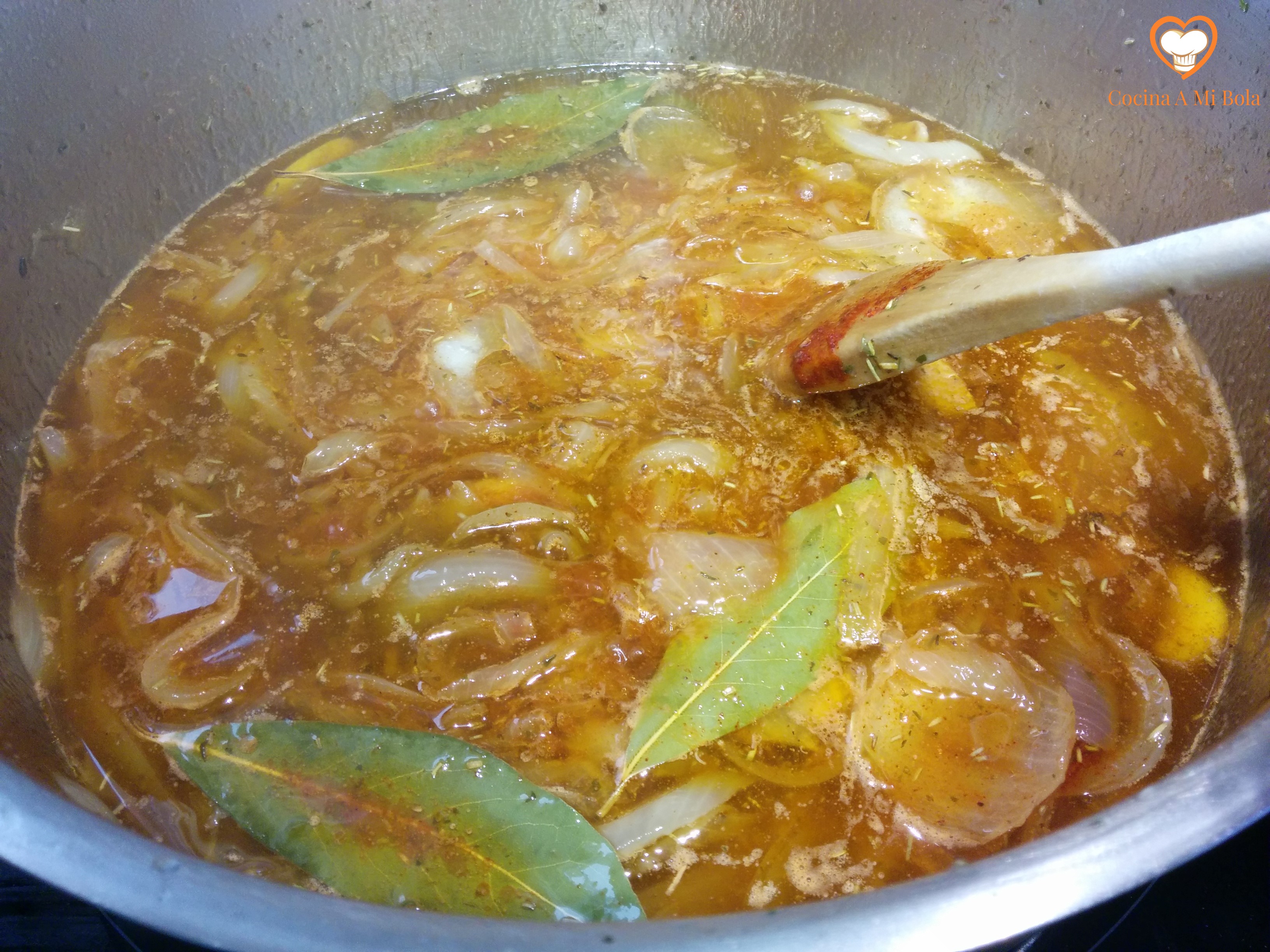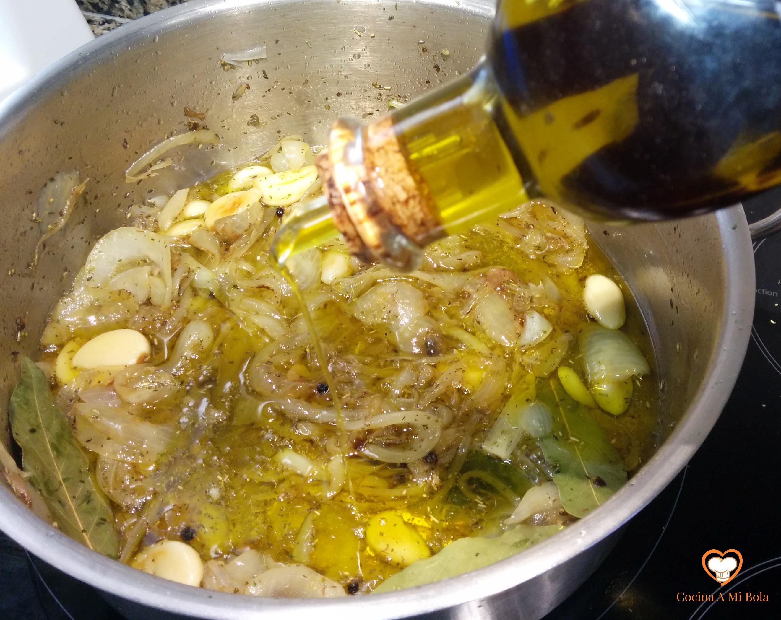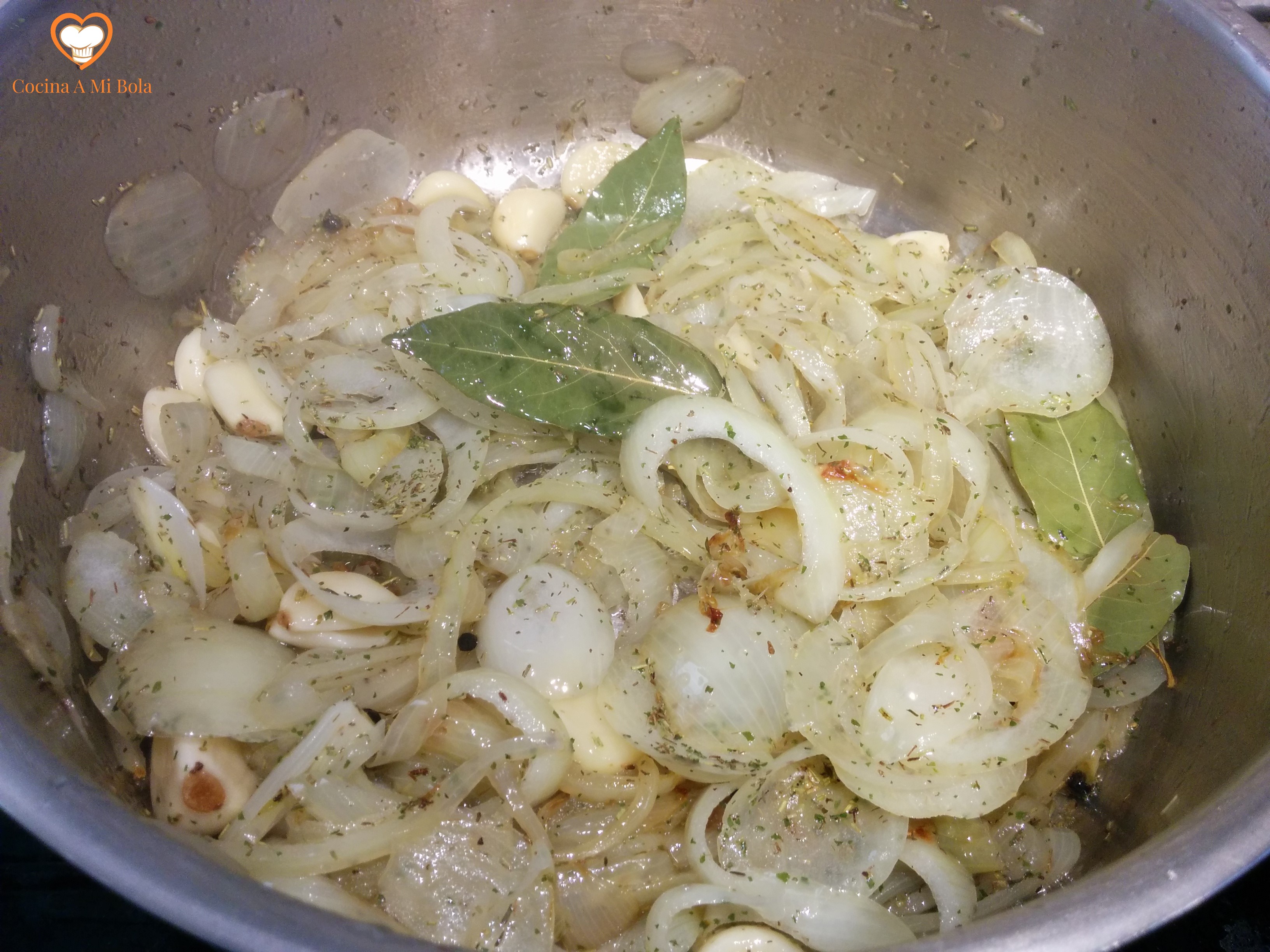 CUARTO.- Añade los dientes de ajo pelados y enteros y echa ahora todas las especias menos el pimentón, es decir, el romero (no demasiado), los granos de pimienta, el tomillo, el clavo y el perejil. Si el romero y el tomillo los tuvieras en rama, mejor que mejor. Remueve y deja que las hierbas vayan aportando sus aromas a la cebolla y al aceite. Como decía antes, no dejes que se dore la cebolla porque la queremos tierna pero carnosa, así que cuando esté blanda y transparente, podemos seguir con el aliño.