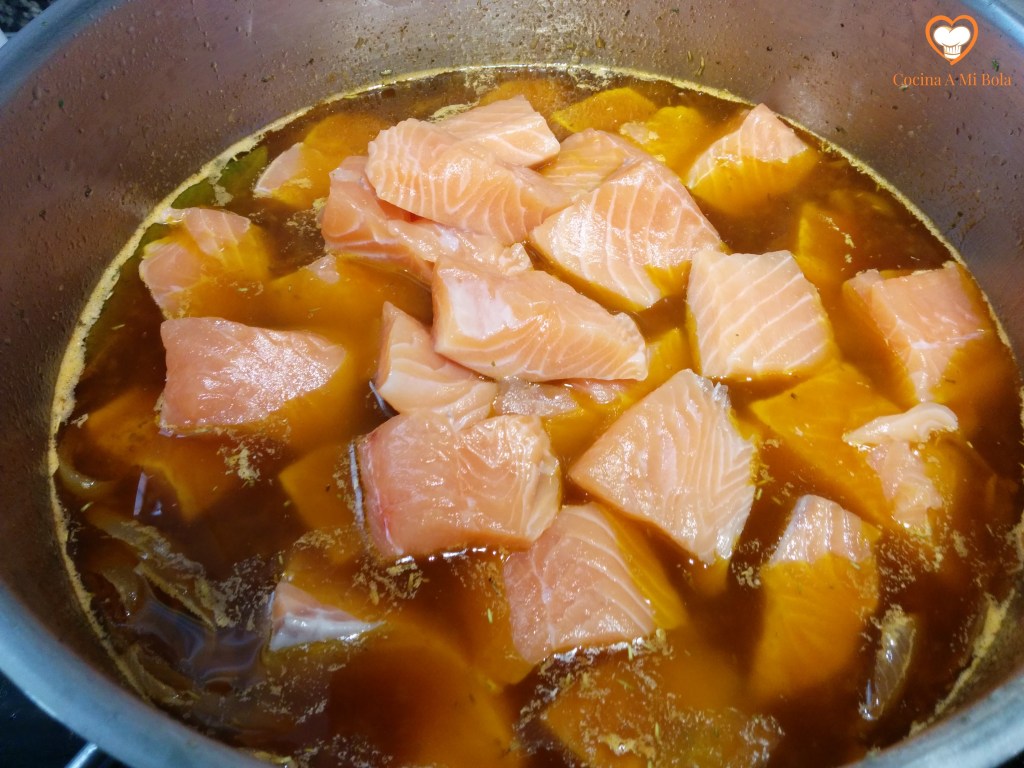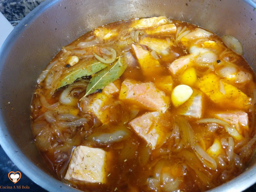 OCTAVO.- Transcurrido el tiempo, apagamos el fuego y vamos echando las tajadas de salmón, procurando colocarlas bien y que estén cubiertas de salsa. Tapa la olla y déjalo enfriar hasta que puedas ya meterlo en la nevera, donde debería permanecer al menos una noche, aunque es mejor un día completo para que el marinado (escabeche) cocine el pescado. No es cuestión de temperatura, sino de curarse con el ácido.