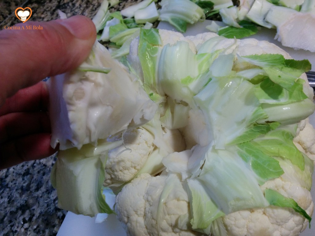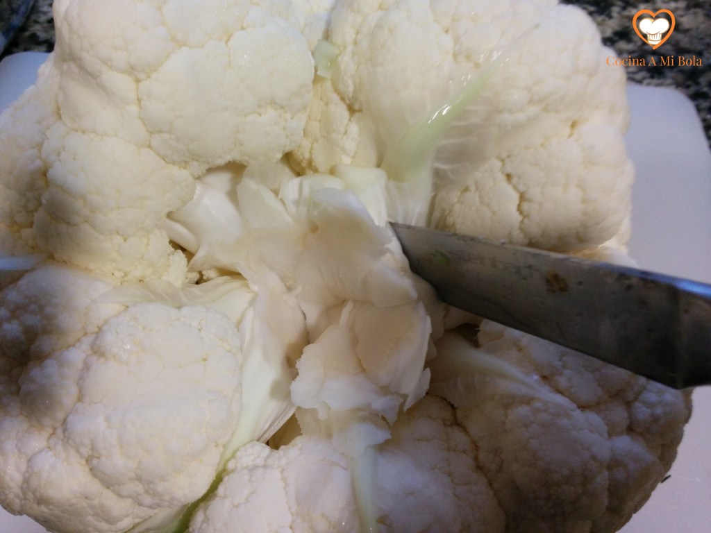 PRIMERO.- Procura escoger una buena coliflor en el mercado, que sea blanca, dura y compacta. Toma un cuchillo mediano y córtale el tallo hasta enrasarlo con la base de la coliflor. Ahora mete el cuchillo desde el borde exterior del tallo hacia el centro de éste procurando hacer un corte alrededor, de forma que cuando hayamos dado toda la vuelta, puedas tirar de él y que salga entero. Normalmente, se irán desprendiendo los diversos arbolitos que, unidos, conforman la coliflor. De no ser así, haz un corte ligero sobre el tronquito de cada árbol para que se separe.