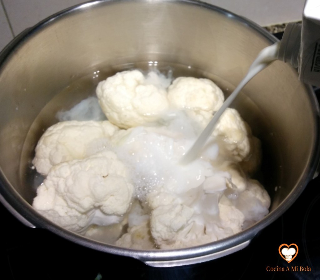 SEGUNDO.- Pon los arbolitos en una olla (mitad agua y mitad leche) a hervir y añádele un puñado de sal. No hace falta que cubra la coliflor en absoluto. La leche es para paliar en la medida de lo posible el olor sulfuroso que desprende la cocción. Hay otros trucos y ninguno de ellos sirve enteramente. La leche mitiga parcialmente el problema, pero de ningún modo lo soluciona.