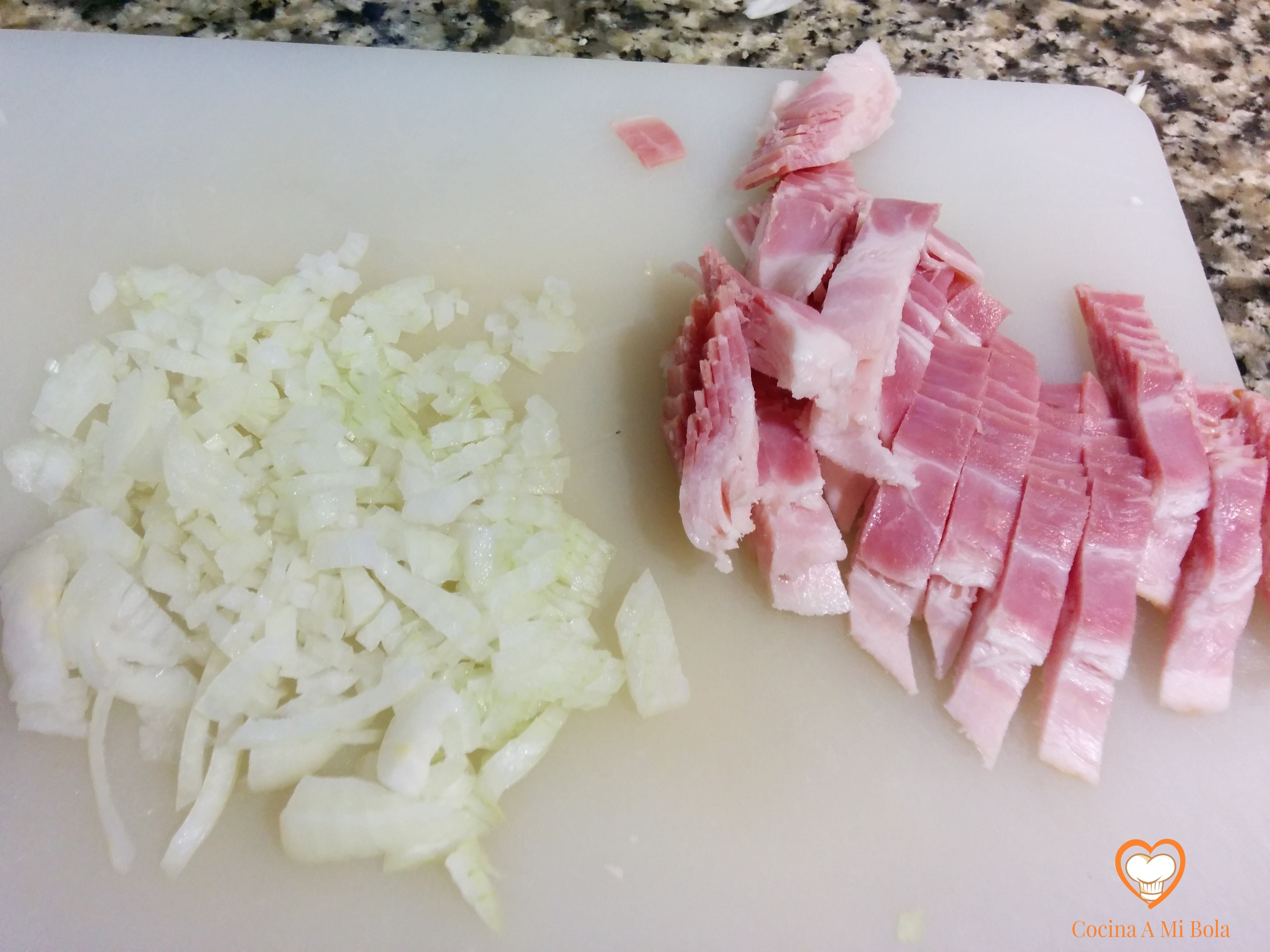 QUINTO.- En una sartén con dos cucharadas de aceite de oliva virgen extra echa media cebolla pequeña picada en trocitos. En cuanto se dore un poco, echa la harina de la bechamel para que se tueste un poco y sigue mis indicaciones que tienes haciendo click aquí, pero con las cantidades que indico en ésta. Hoy día, los termo-robots de cocina hacen una bechamel muy resultona, así que si no hay prisa, a mano; y si no, pues recurre a los aparatos modernos, que para eso están.