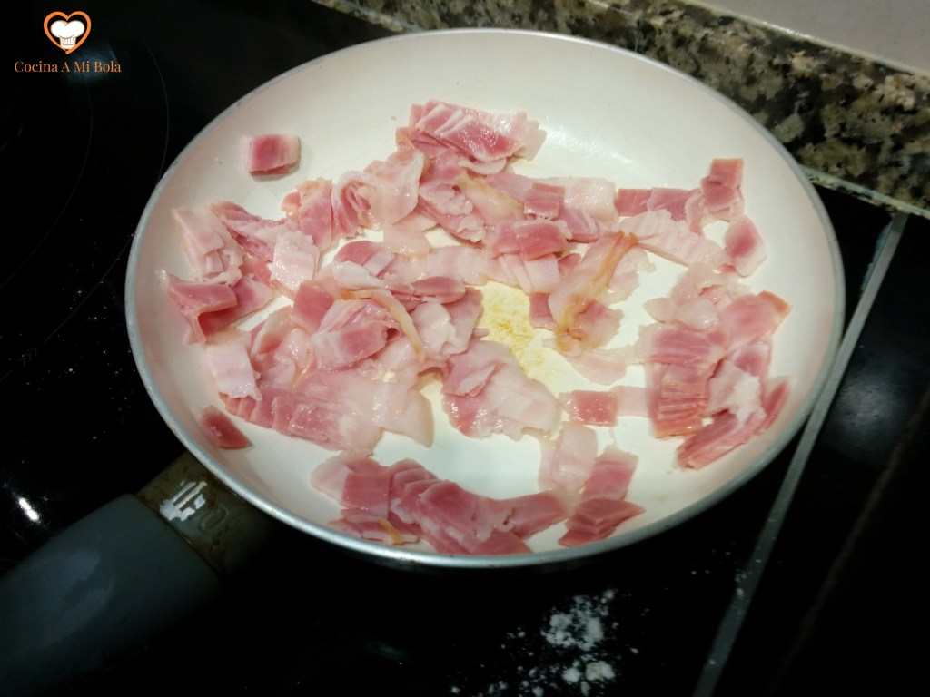 CUARTO.- Corta el bacon en trozos pequeños y ponlos a dorar a fuego lento sin aceite para que pierdan una parte importante de su grasa, que retiraremos. Distribúyelo bien por encima de la coliflor.