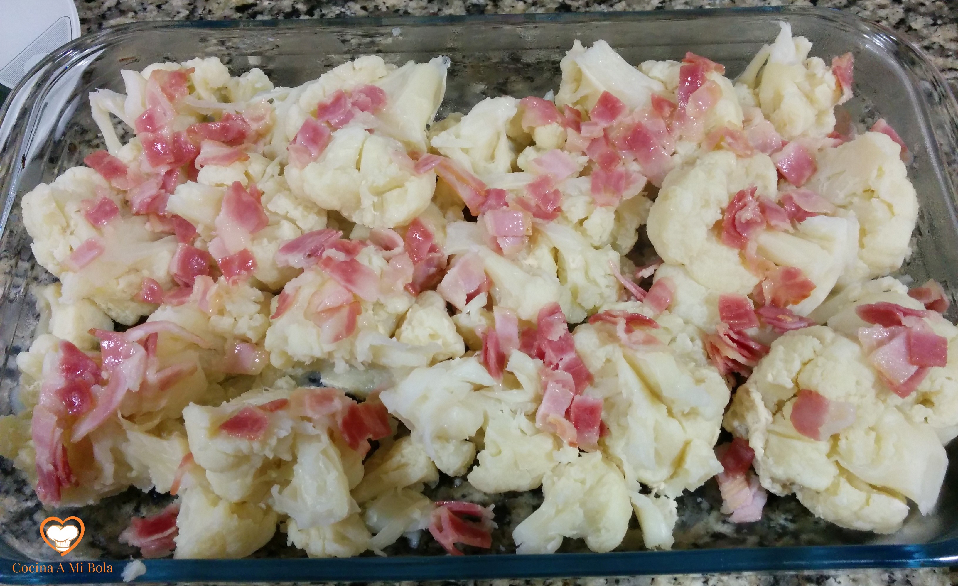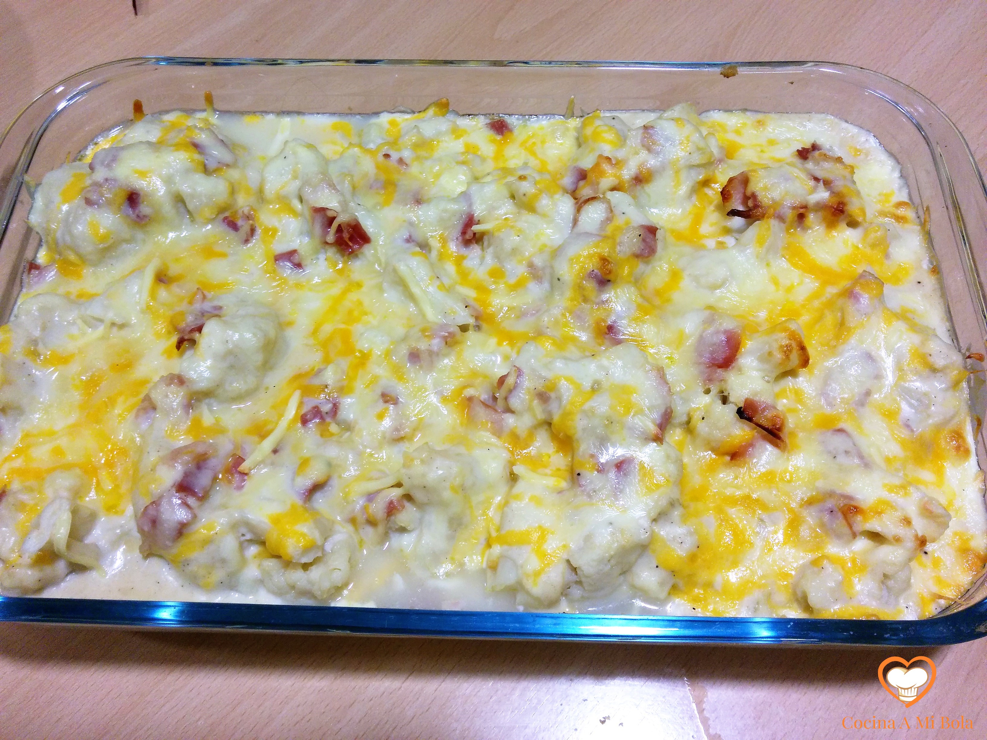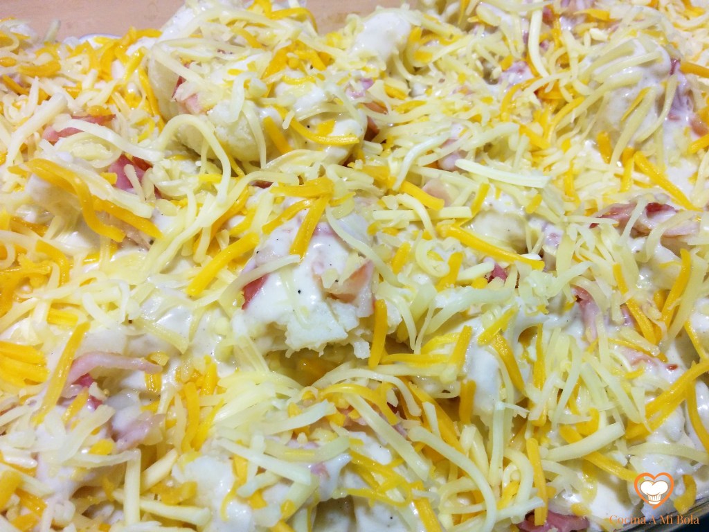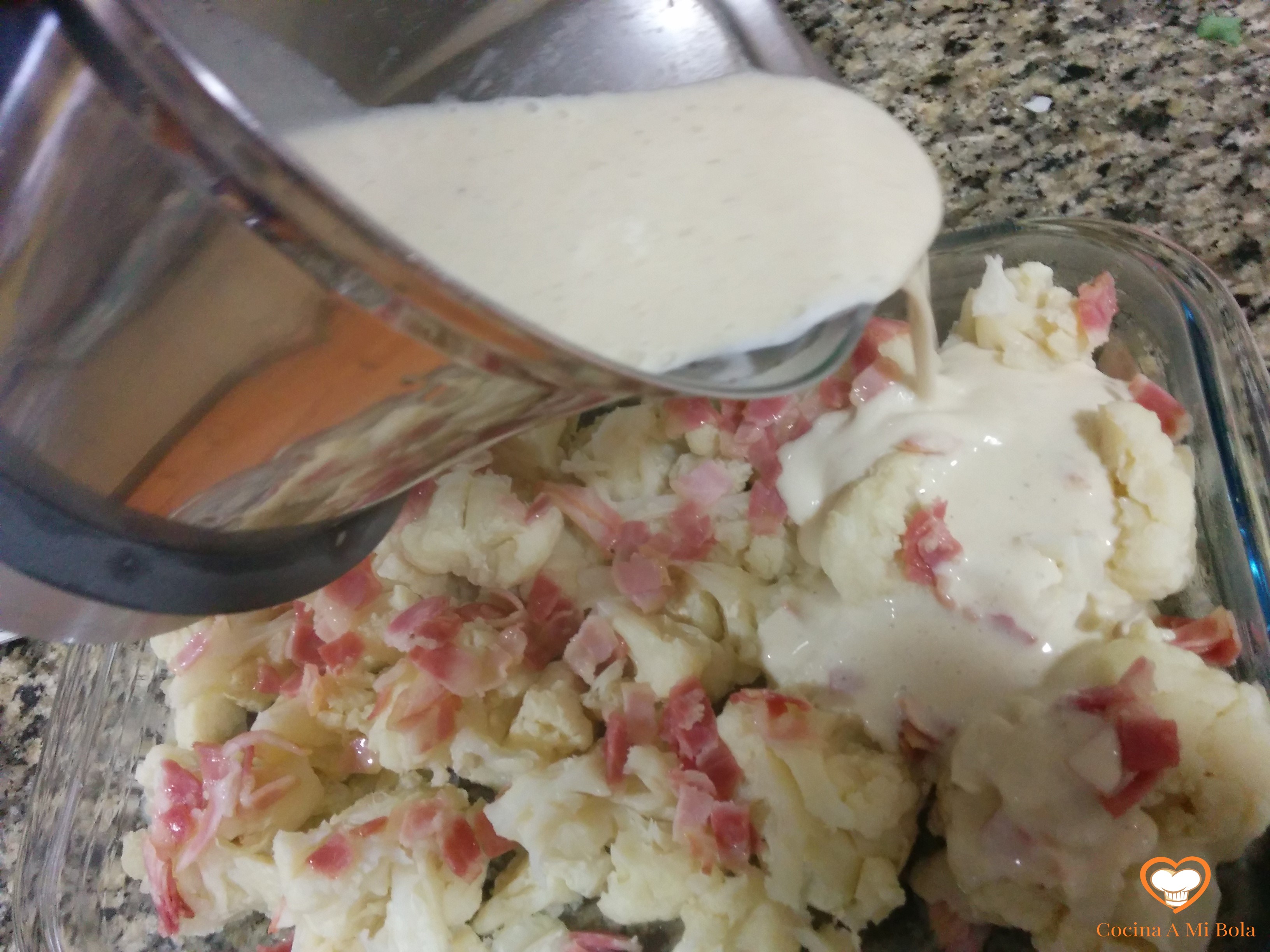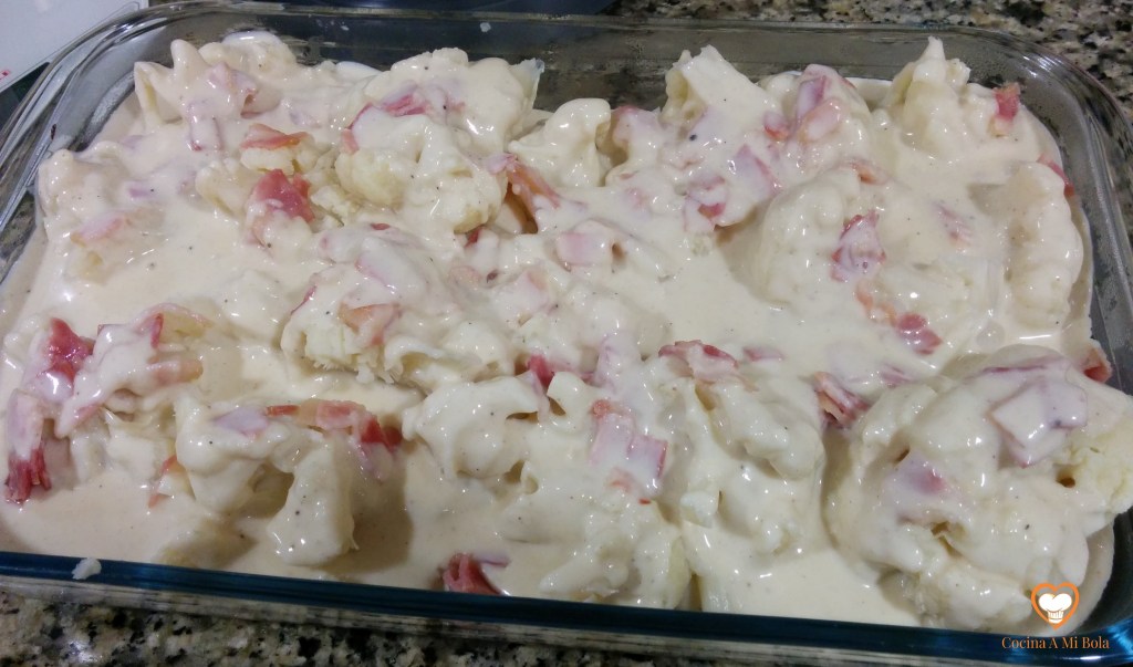 SEXTO.- Una vez hecha la bechamel, échala por toda la fuente sobre la coliflor y el bacon. Procura una distribución de la salsa lo más uniforme posible para que llegue a todas partes. Verás que la cantidad es la justa, pero si te gusta mayor cantidad, amplía proporcionalmente las dosis que aquí te doy y ya está.