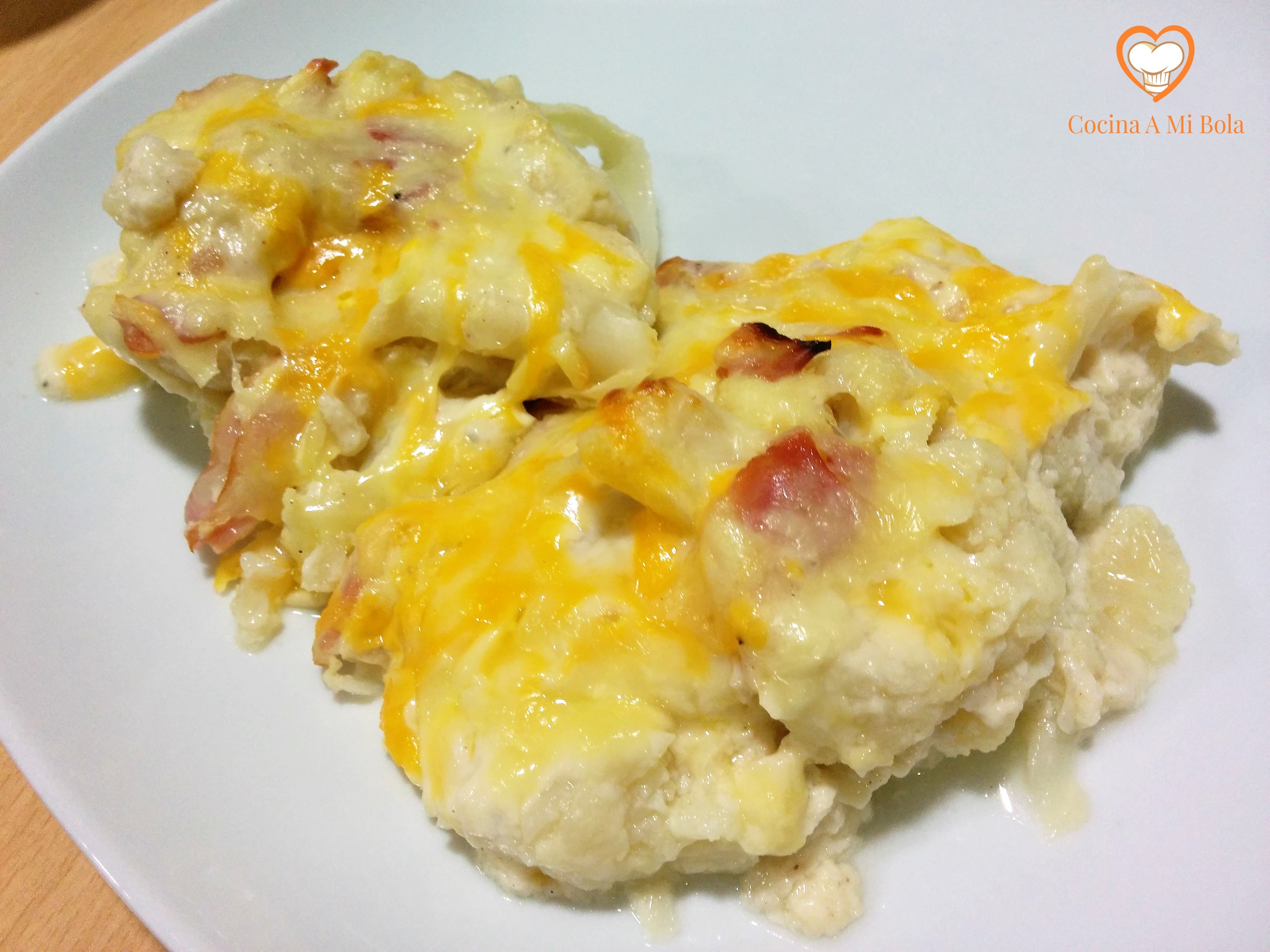INGREDIENTES: 1 coliflor, 150 grs bacon, 100 grs queso de gratinar, media cebolla pequeña, sal, salsa bechamel (600 cc leche, 60 grs harina, 30 grs mantequilla, 1 cucharada sopera de aceite de oliva virgen extra, pimienta negra molida, nuez moscada y sal).
