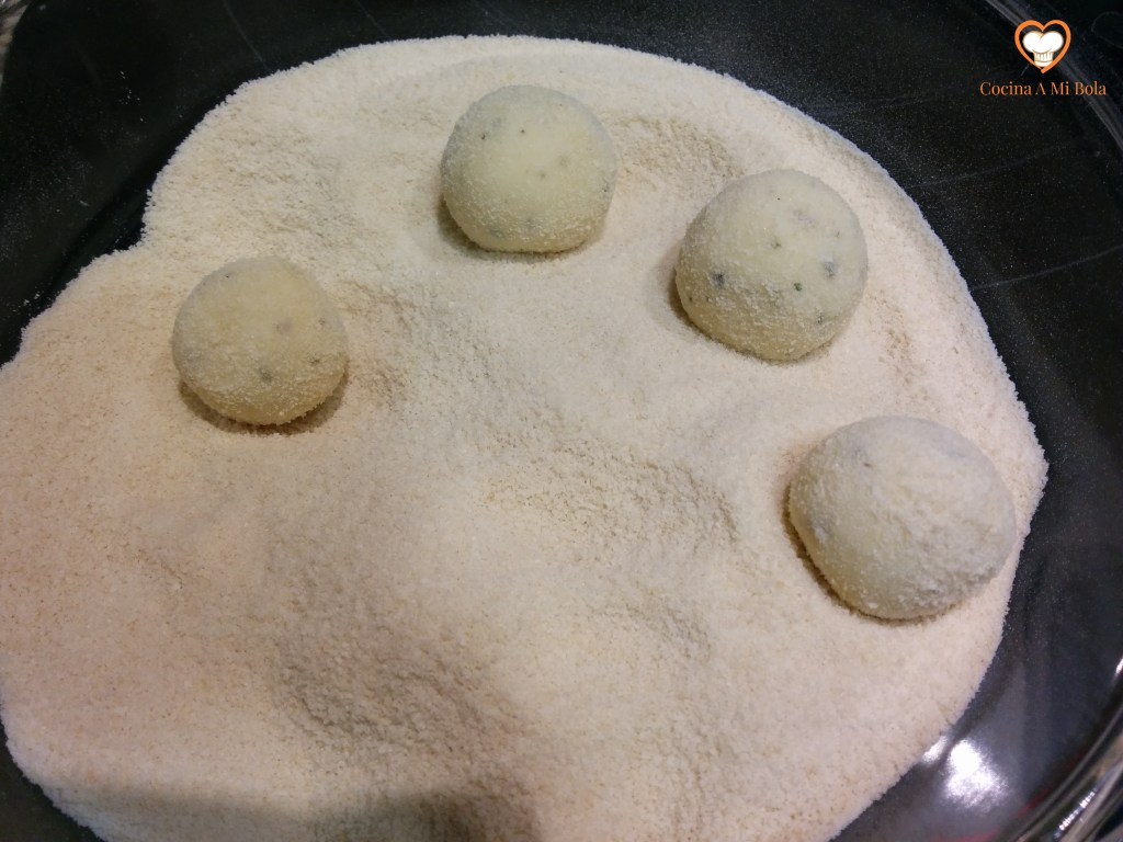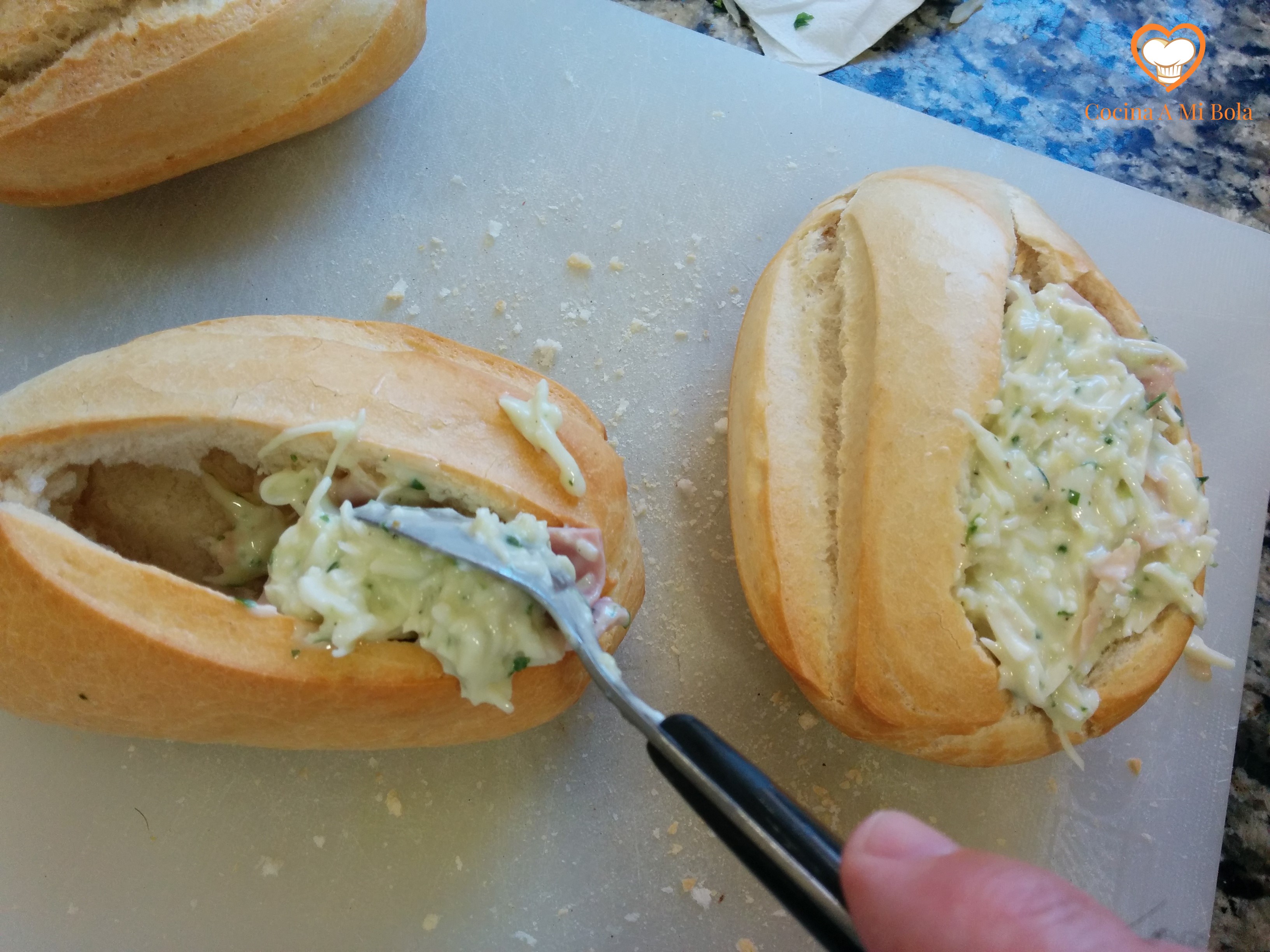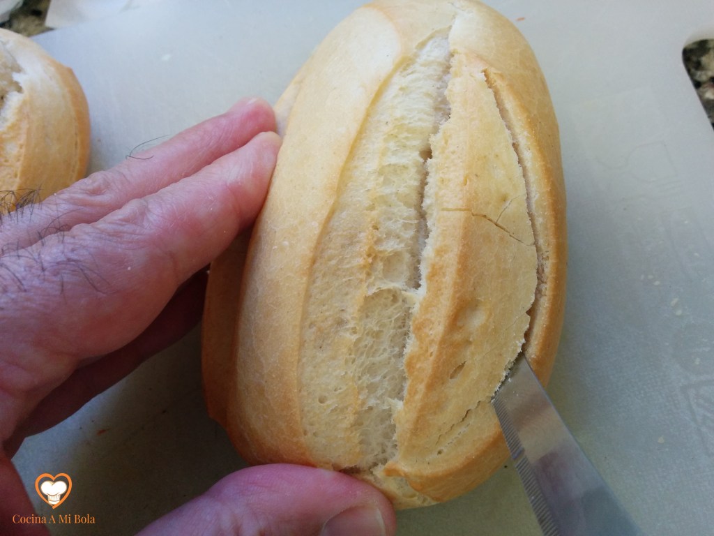 QUINTO.- Vacía la miga del panecillo y rellénalo con la mezcla que hemos hecho. Compacta un poco para que se llene bien y a continuación cubre el relleno con queso rallado.