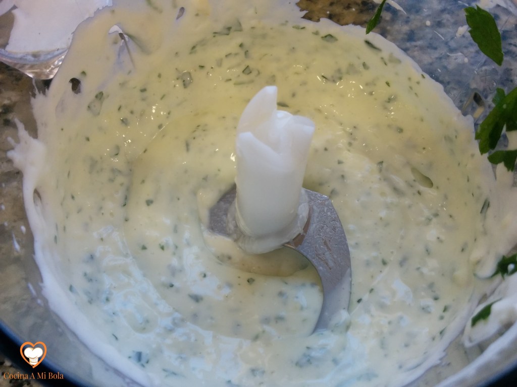 PRIMERO.- Lo primero es hacer una salsa de yogur, así que echaremos en el vaso de la batidora unas hojas de perejil, el zumo de medio limón, la pimienta negra, el comino y una cucharadita de azúcar. Batimos bien y agregamos el yogur y la mayonesa para, a continuación, batir de nuevo. Reservar en la nevera.