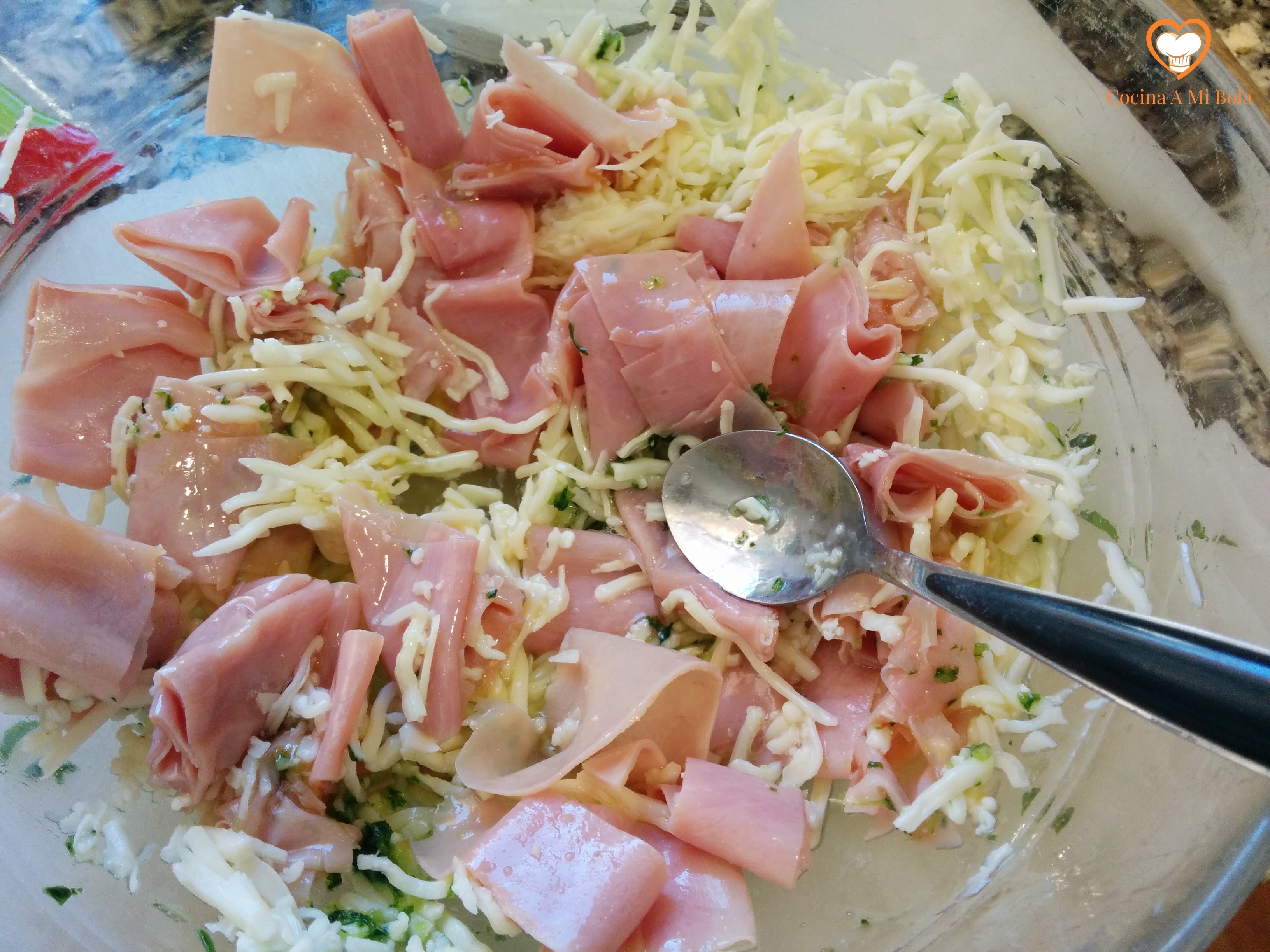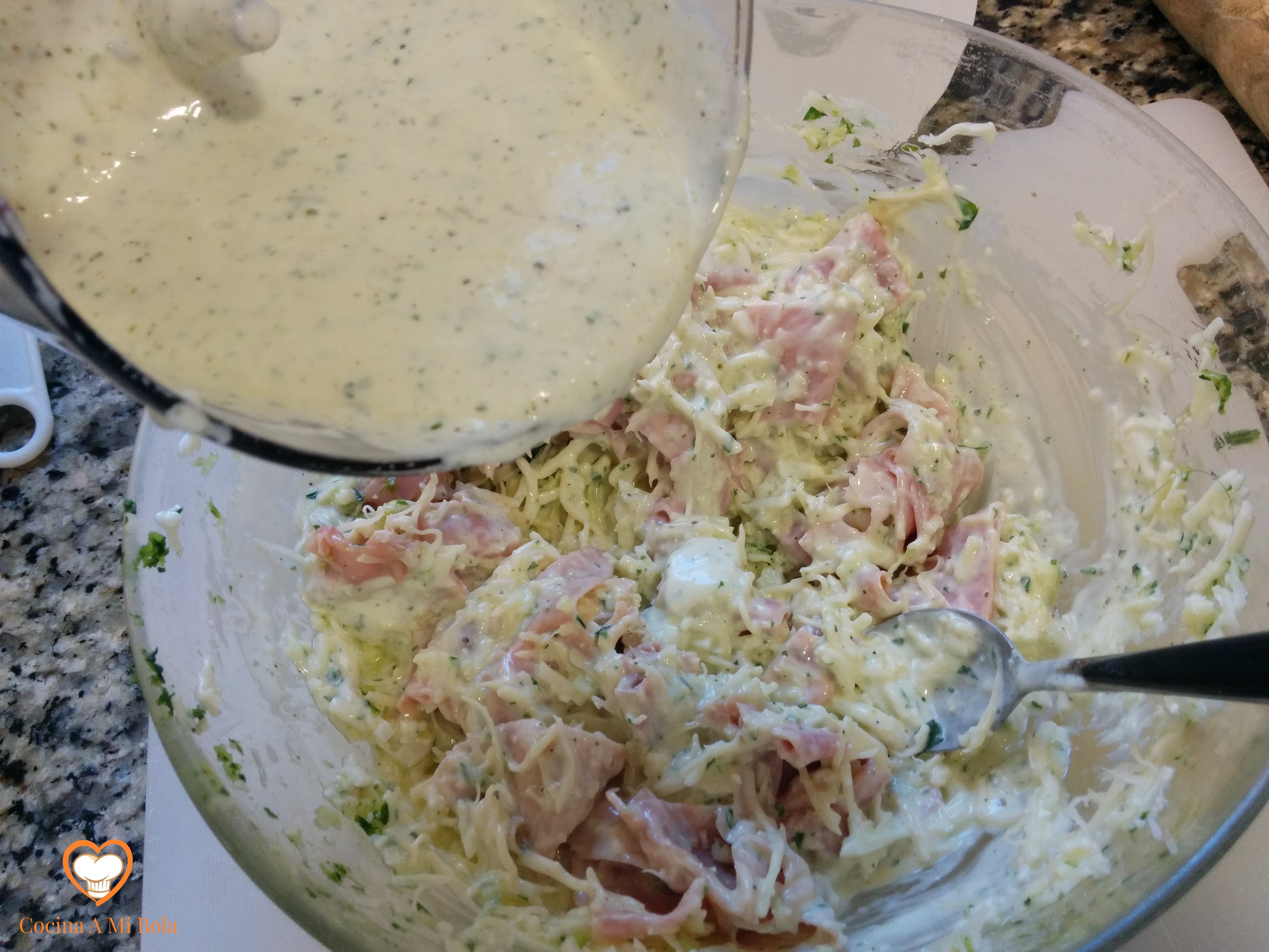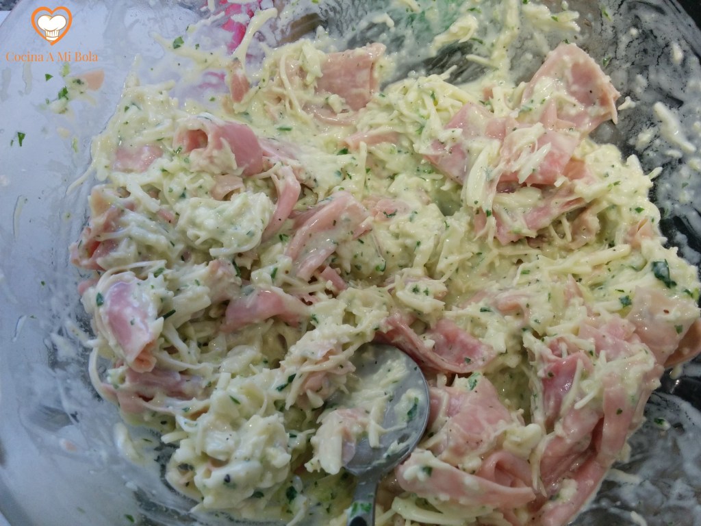 TERCERO.- Añade 50 gramos de mozzarella rallada, el parmesano rallado y un huevo. Haz una picada pequeña de perejil picado y medio diente de ajo. Mézclalo todo bien con una cuchara. Y por último, echa un par de cucharadas o tres de salsa de yogur y remueve bien. No pongas mucha salsa porque el exceso puede resultar muy pesado.