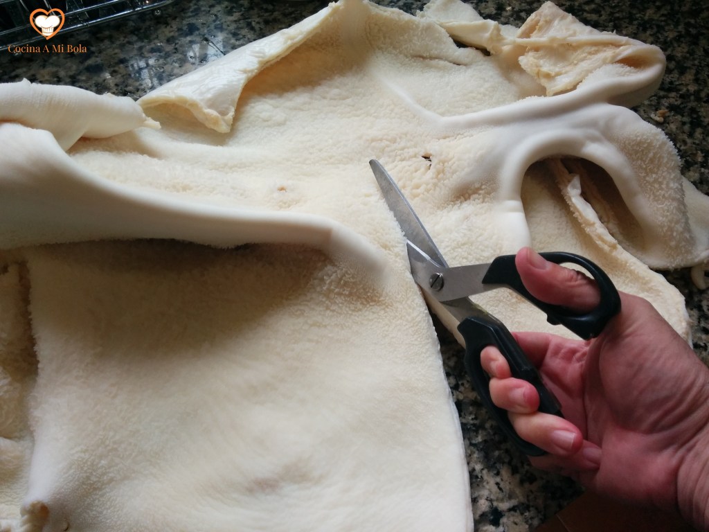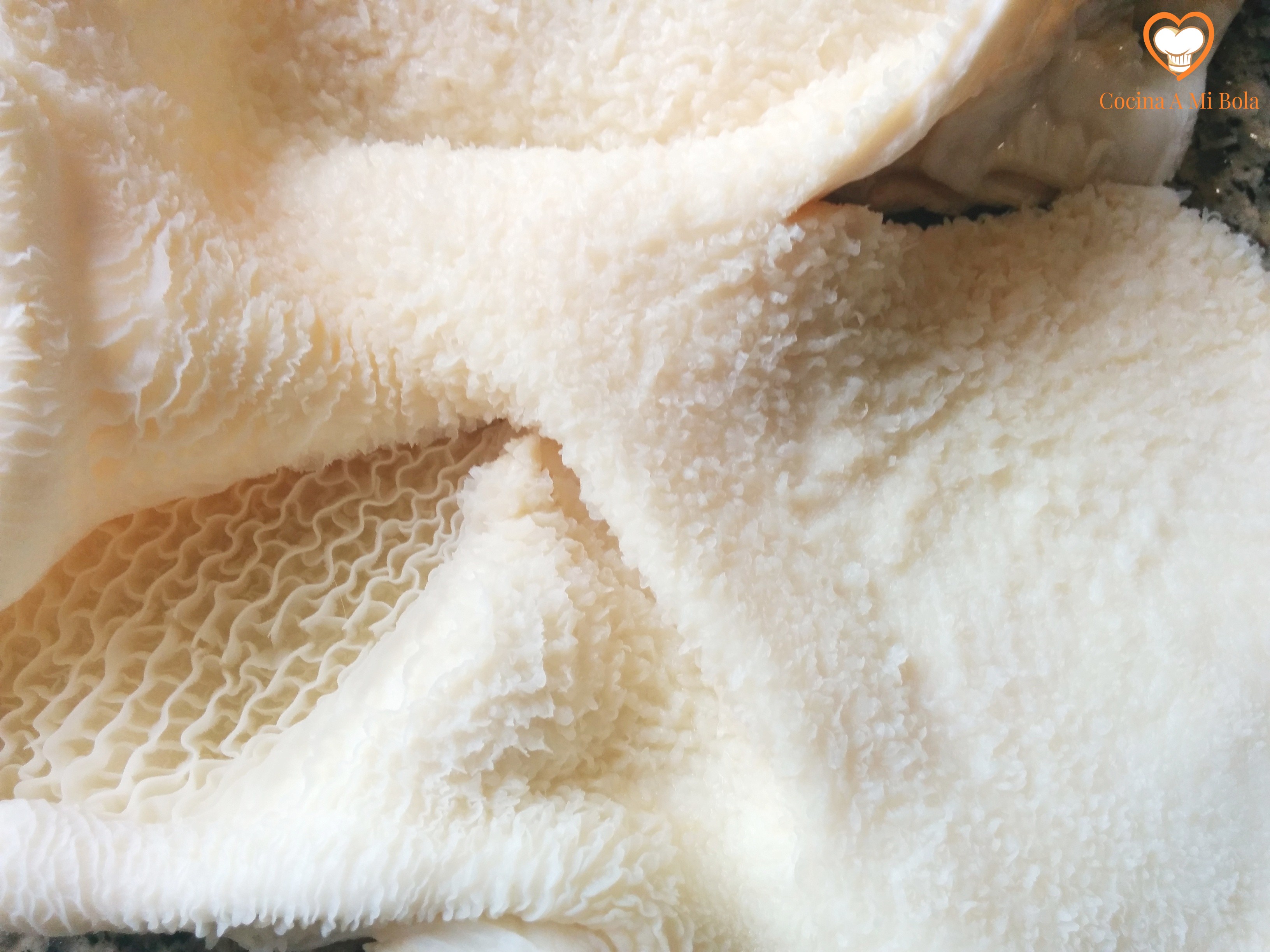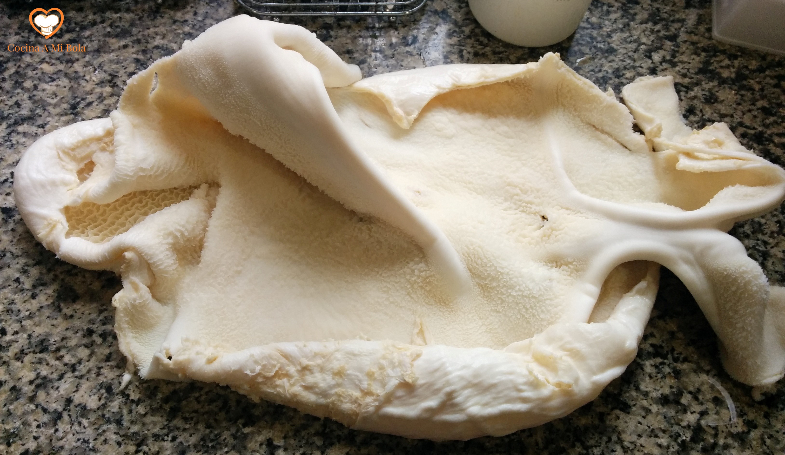 Si quieres saber más sobre el origen, tratamiento y preparación de los callos para guisarlos, sigue leyendo. Pero si no te hace falta profundizar, salta AHORA al punto primero, porque no te va a gustar lo que viene a continuación. LIMPIEZA Y COCCIÓN.- Un estómago entero de ternera pesa unos 4,5 kg y hoy día los podemos encontrar en industrias cárnicas (generalmente por encargo) y te los dan ya limpios; blanquitos y muy bien lavados, pero dada la pieza en cuestión, yo los corto en trozos grandes y los lavo un poco más en agua y frotándolos enérgicamente con sal gruesa. Ahora hay que escaldarlos: échalos en agua hirviendo con un buen vaso de vinagre durante no más de cuatro o cinco minutos para sacarlos rápidamente y enfriarlos bajo el grifo. El problema de los callos es que al cocerlos desprenden un olor absolutamente disuasorio. Es un hedor muy penetrante a “animal” que en los pueblos de Madrid y castellanos llaman “bravío”. Por lo que he podido comprobar, la mayor parte de este olor no lo desprende el callo en sí, sino la grasa adiposa que tiene por detrás y que hay que eliminar lo más posible con una puntilla afilada y mucho esmero, antes de trocear del todo la pieza. Es de una textura mucho más blanda y maleable y su color algo amarillento. Mira bien estas fotos que te pongo a continuación porque tal vez te compense comprarlos ya precocidos y envasados como semiconserva en su propia gelatina. La verdad es que cada vez me cuesta más trabajo encontrarlos porque la mayoría de las cárnicas que los venden envasados, no solo están cocidos, sino ya guisados. Pero si quieres hacerlo todo, córtalos en trozos no muy pequeños y ponlos a cocer en olla express una hora aproximadamente en agua con una cebolla entera, un puñadito de granos de pimienta negra, cuatro o cinco clavos, dos hojas de laurel y un vaso de vino blanco. Mejor, la víspera.