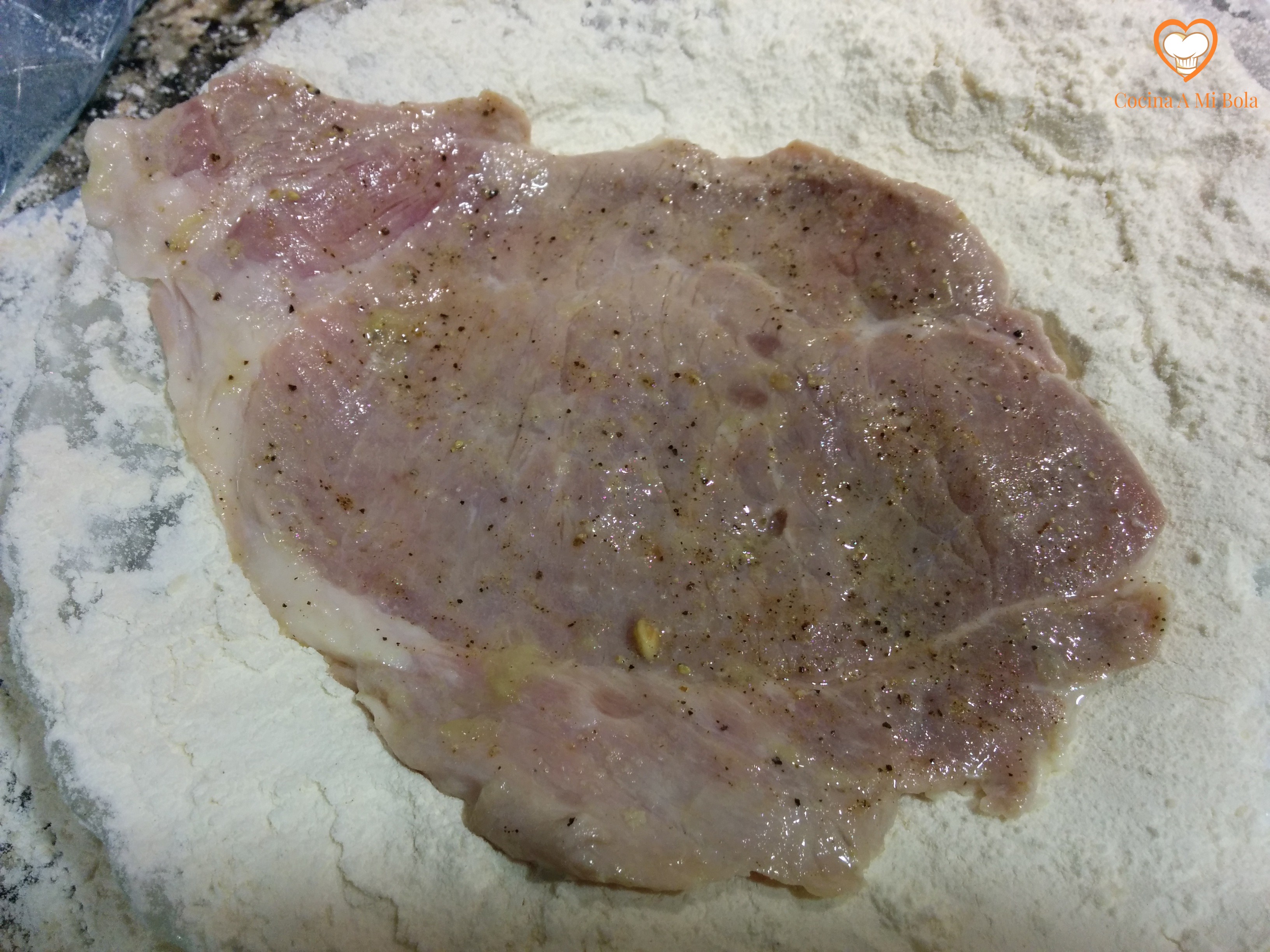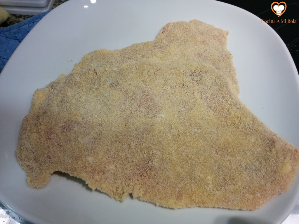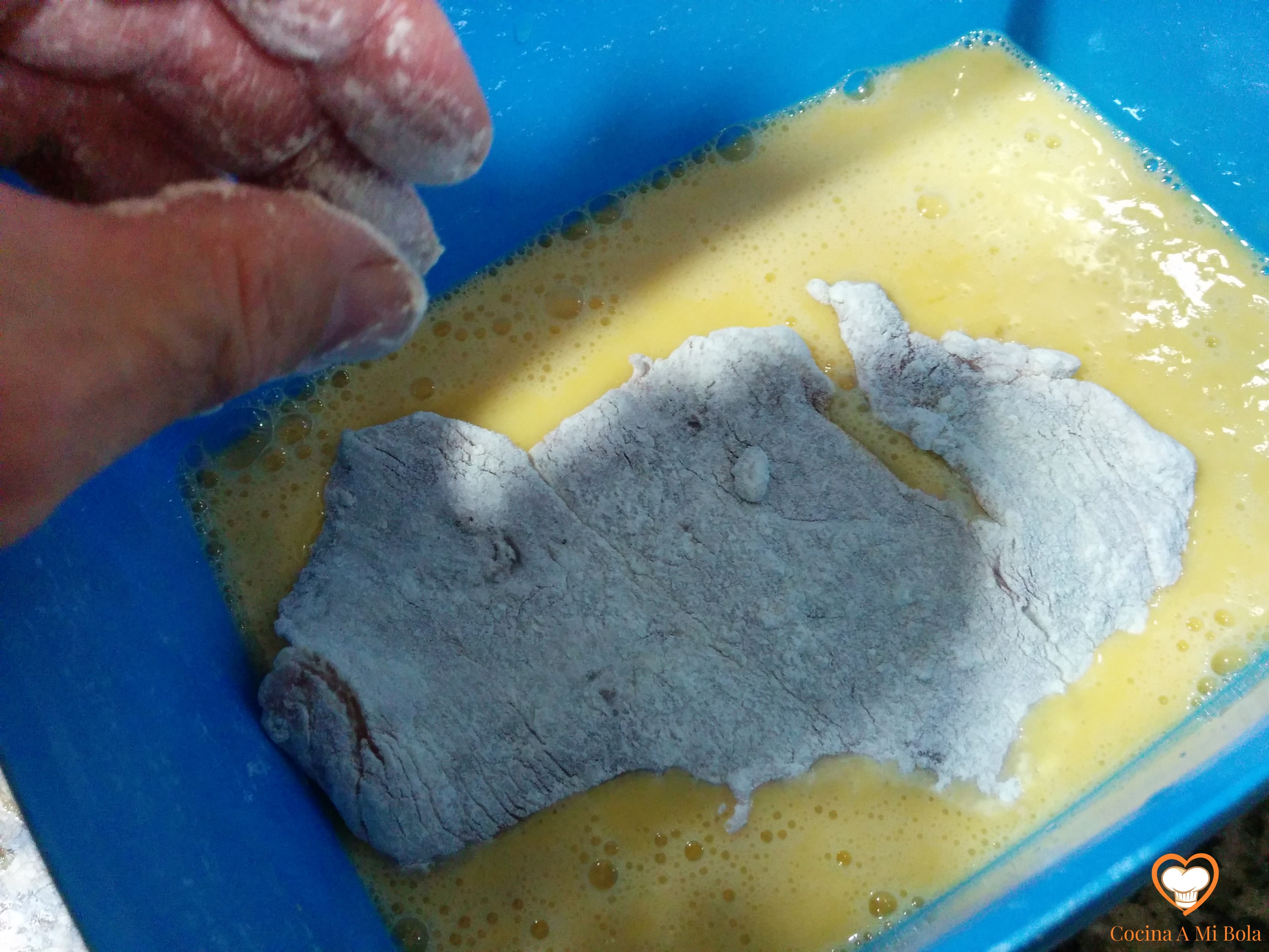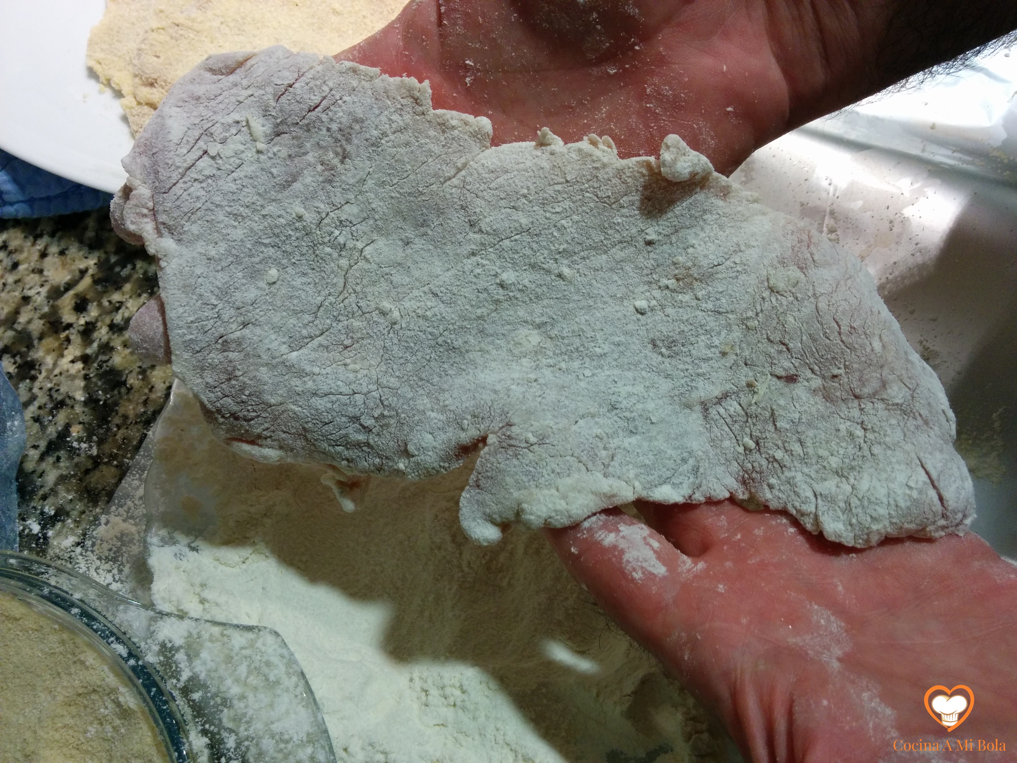 CUARTO.- Ahora, mezclamos bien ambas harinas en un plato, vamos tomando uno a uno los filetes y los rebozamos, presionando bien para que la harina se adhiera a la carne, y sacudiéndolos después para que caiga la sobrante.