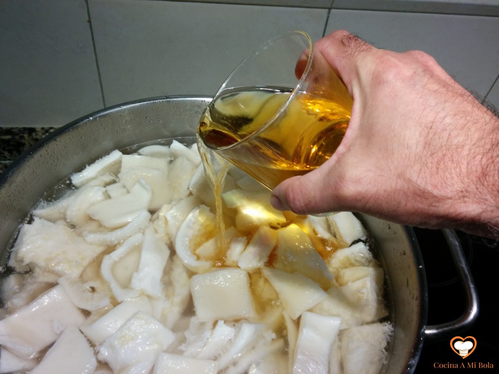 SEXTO.- En cuanto veamos que los líquidos del principio han reducido considerablemente, echaremos medio vasito de fino y removeremos bien, dejándolo rehogar todo unos cinco minutos más mientras evapora el alcohol. Apaga el fuego.