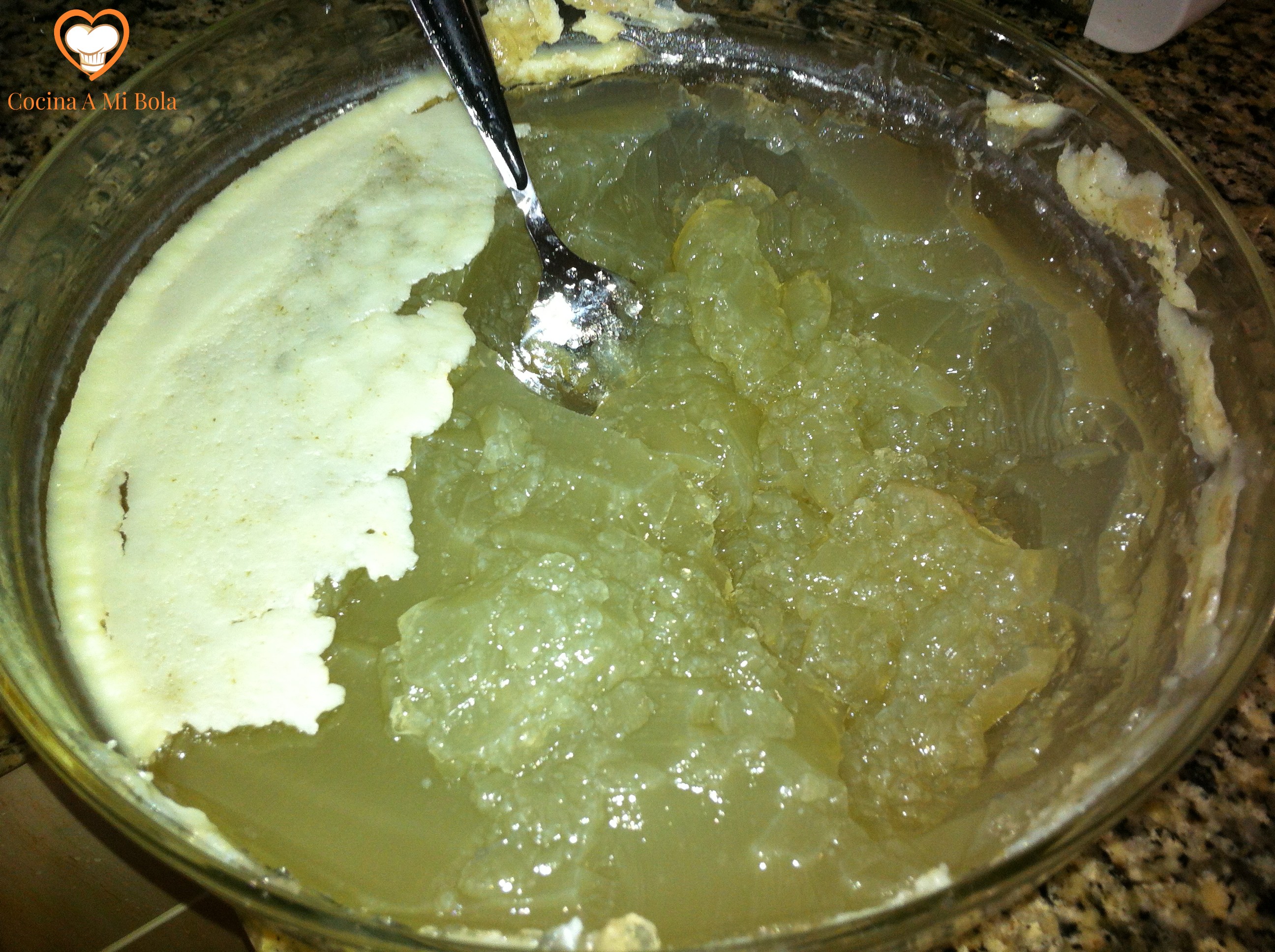 SEGUNDO.- Ya al día siguiente (o simplemente unas horas después), recuperalo del frigorífico . Verás que sobre la superficie se ha solidificado toda la grasa que han soltado en la cocción. Es blanca y densa; manteca pura…. y aunque contribuiría a darle al guiso un magnifico sabor, yo prefiero eliminarla porque es terriblemente perjudicial para la salud y para una digestión tranquila. Por otra parte, otros aportaremos otros elementos que dejarán ya bastante grasa. Nos quedamos con el resto que, como verás, no es grasiento sino muy gelatinoso; colágeno puro.