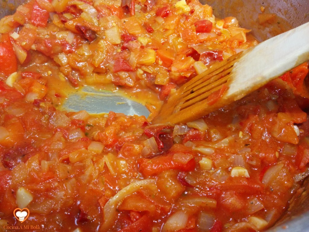 CUARTO.- Lava bien los tomates y el pimiento rojo, córtalos en trozos pequeños y resérvalos para echarlos a la cazuela en cuanto la cebolla esté transparente y a medio hacer. Sube el fuego y ponle sal, orégano, media cucharadita de comino molido, pimienta negra molida y un par de cucharadas (de postre) de azúcar que neutralizará un poco la acidez que aporta el tomate.