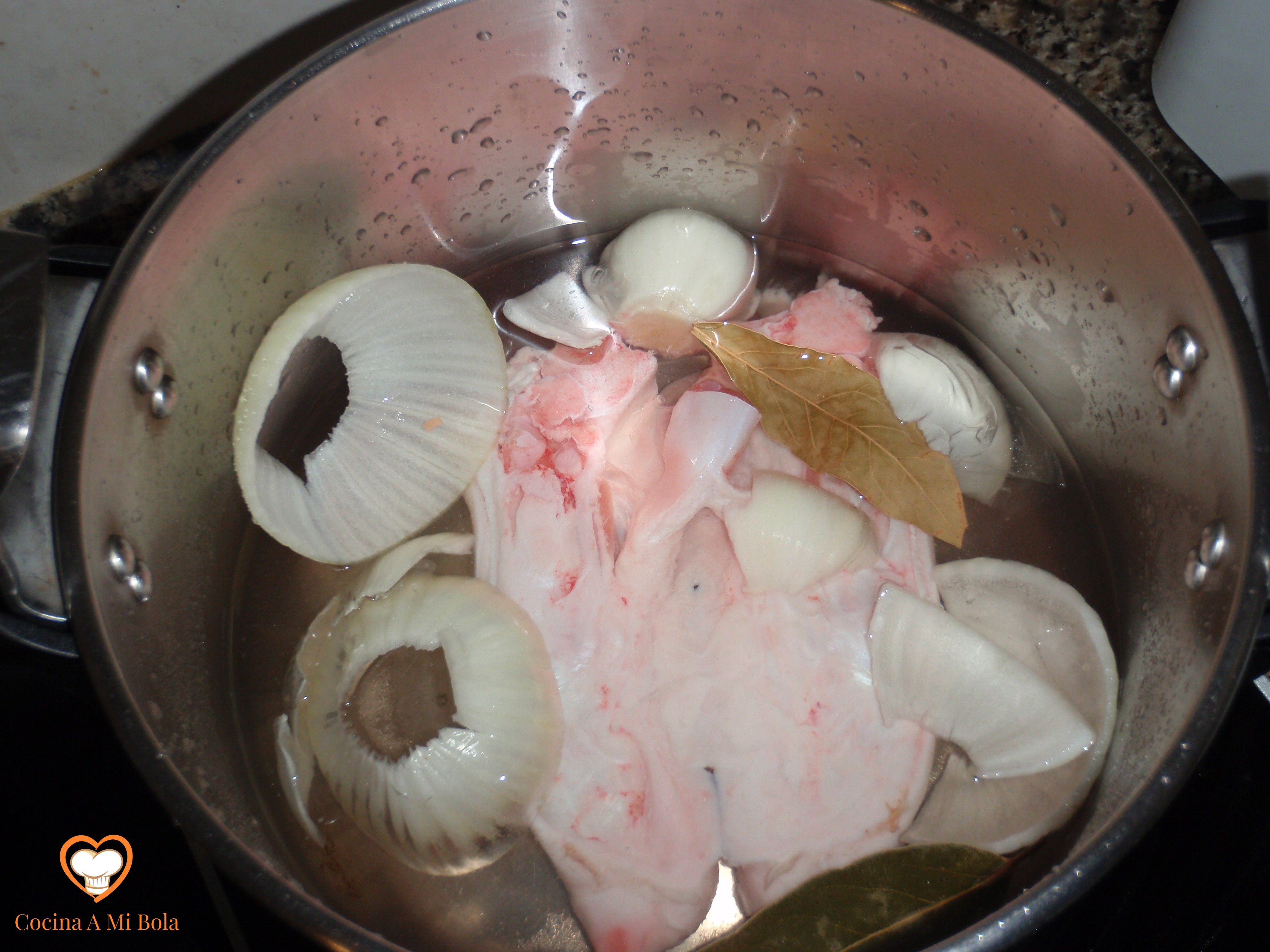 PRIMERO.- Para conseguir esa textura en la salsa que hace que se nos peguen los labios al comerlo, necesitamos incorporar media mano de ternera o una o dos manitas de cerdo ya que aportarán esa gelatina necesaria para ello. También será mejor cocerlas la víspera. Sigue las instrucciones del apartado primero de la recetamanitas de cerdo, pero con una salvedad: déjalas cocer 30 minutos más para que se deshagan un poco, de forma que cuando hayan enfriado, podamos deshuesarlas totalmente, eliminando las pezuñitas, los huesos principales (proximales) y todos los demás huesitos palmares que tiene la mano del cerdo. Cuela el caldo de la cocción con las manitas ya deshuesadas y en cuanto haya enfriado, mételo en la nevera.