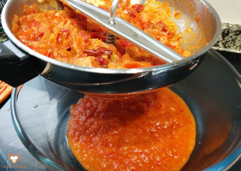 SÉPTIMO.- Busca las dos hojas de laurel y retíralas momentáneamente. Coloca ahora el pasapurés sobre un bowl y ve pasando todo el contenido de la cazuela. Es una labor que requiere cierta paciencia pero el resultado vale la pena porque queda una salsa de tomate gruesa y bien trabada. ¿Más fácil con la batidora?. En efecto, pero pasará de su color rojizo natural a otro muy anaranjado, y además perderemos esa textura gordita que antes decía y que es tan importante cuando uno se arma de pan y pasa al ataque…