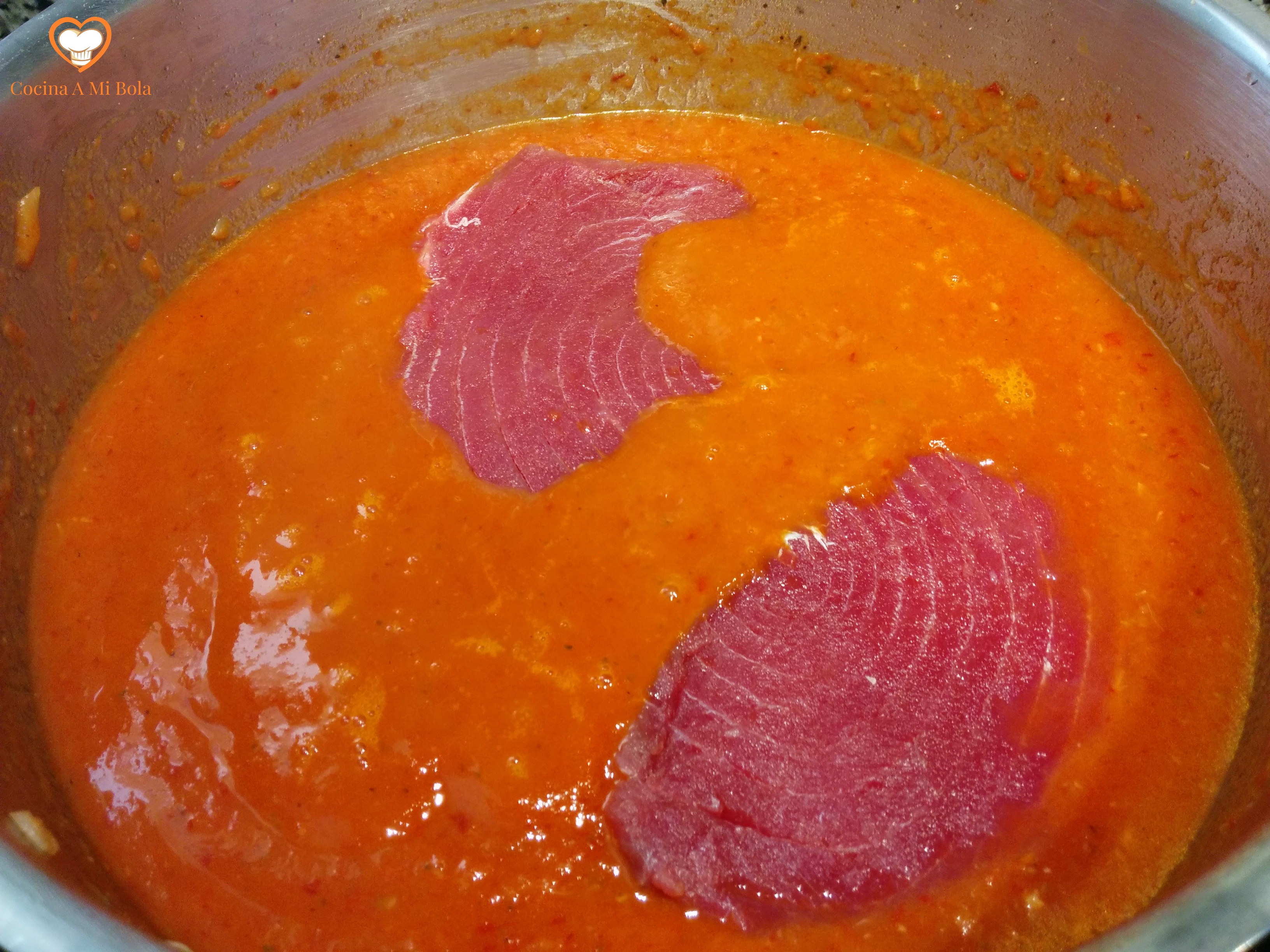 NOVENO.- Ya sólo nos resta echar el atún a la salsa, pero procura hacerlo a última hora, de manera que pueda llevarse a la mesa de inmediato. Si es así, échalo en la cazuela con muchísimo cuidado para que no se rompa. Un solo minuto y apagamos el fuego, dejando que se haga un poco más con el calor residual. Toma la cazuela por sus asas y muévela circularmente para no tener que remover con el cucharón o el palo de madera y no dañar así el pescado.