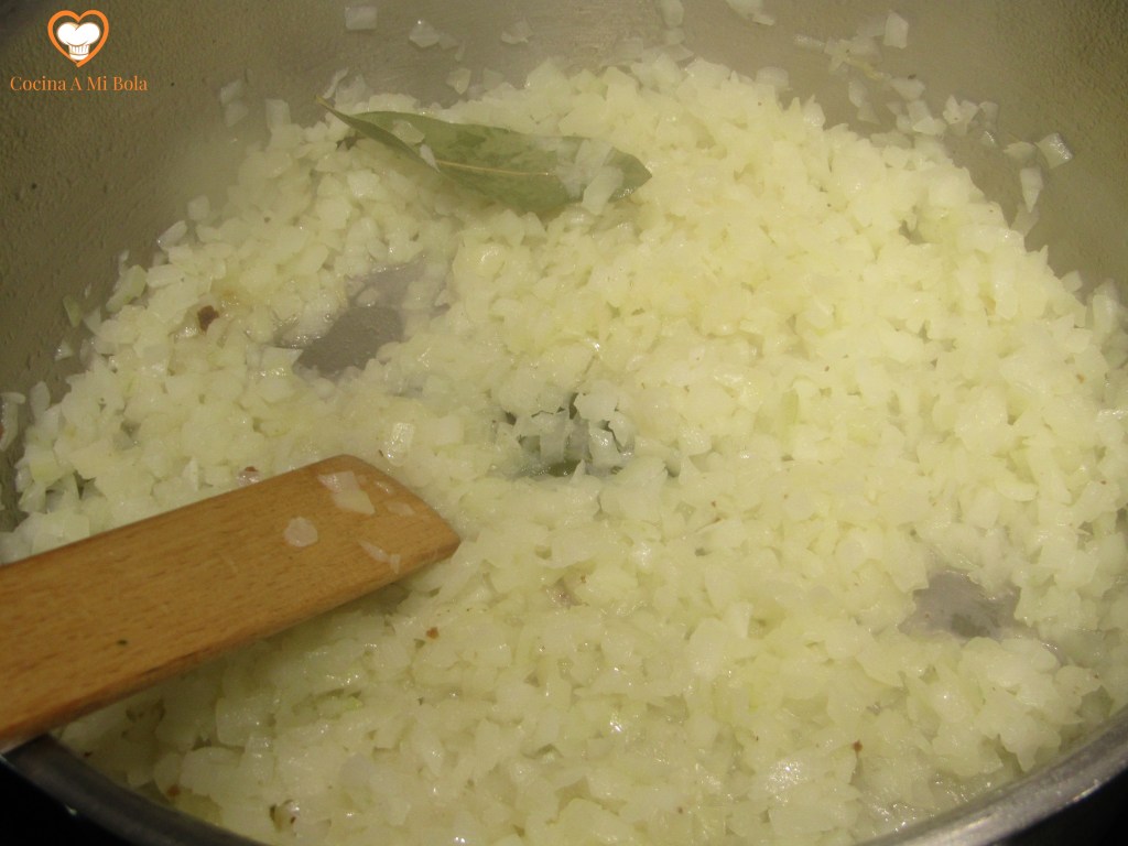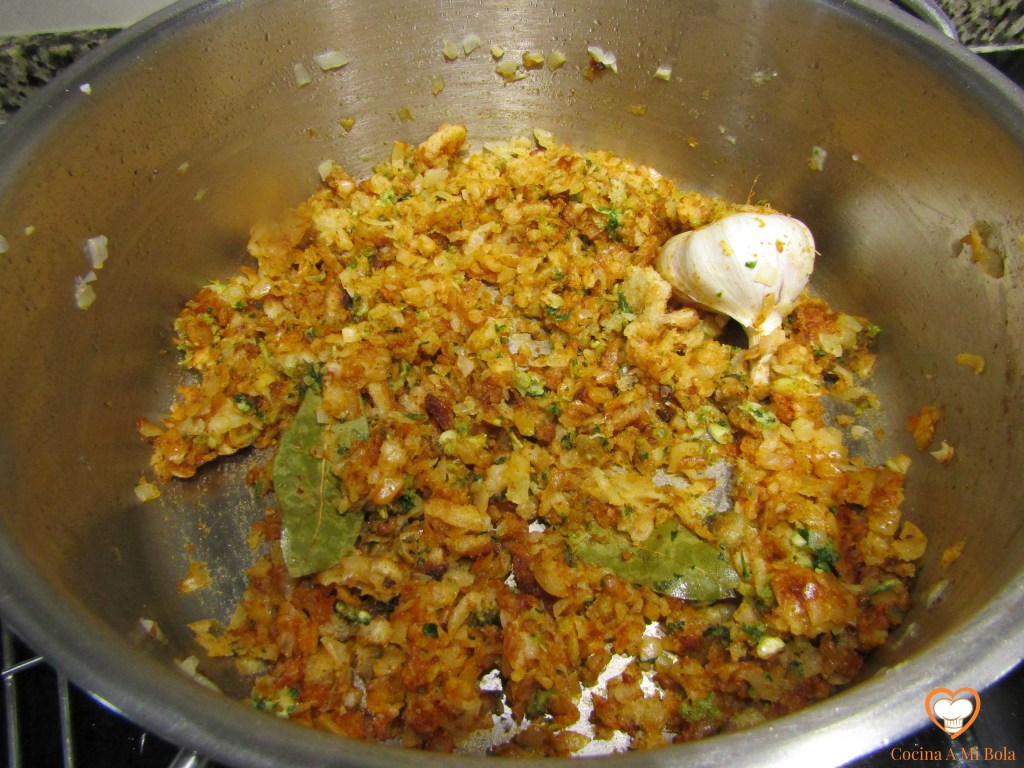CUARTO.- En ese aceite, echa un par de hojas de laurel y sofríe la cebolla a fuego lento hasta que esté transparente y tierna…. incluso un poco dorada. Salpimentar ligeramente. Mientras que se hace la cebolla, en el mortero se pica y machaca el ajo y el perejil hasta que esté todo bien majado, casi una pasta, añadiendo después el pan frito y la cayena (si echas dos o más, te aproximarás más a la receta original que es algo picante, pero tenlo muy en cuenta ahora, porque luego será tarde). Machacar de nuevo, pero ligeramente para que el pan quede a trocitos muy pequeños, en vez de totalmente triturado.