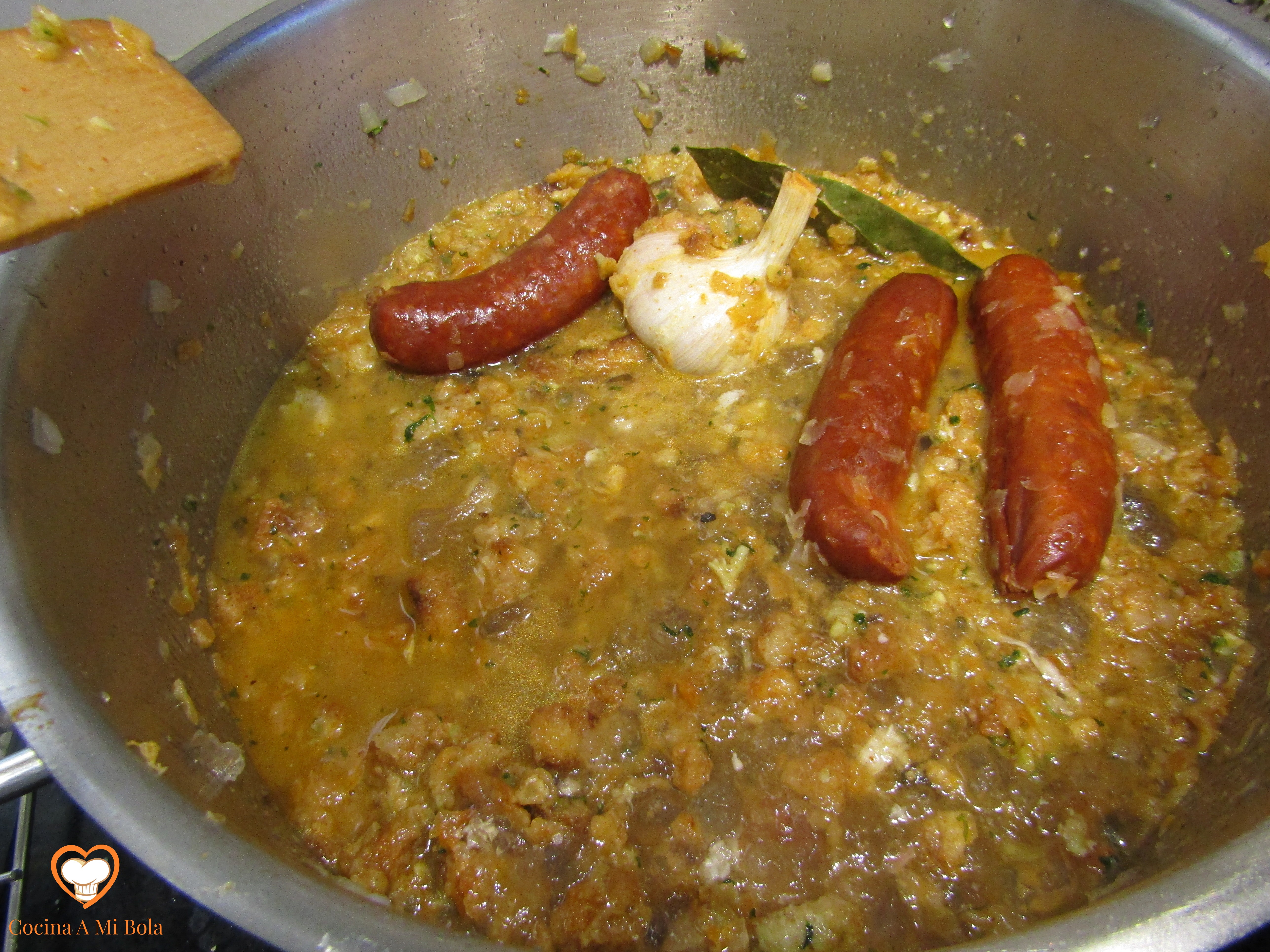QUINTO.- Si ya tenemos la cebolla tierna, retira el exceso de aceite y echa los chorizos y la morcilla para rehogarlo todo junto un rato. Echa ahora el majado que teníamos en el mortero y remueve bien para que rehogue. Tras unos cinco o seis minutos, añade un par de cucharadas de harina de trigo y deja que se tueste unos segundos a fuego bajo para que pierda ese sabor a engrudo que tiene cuando está cruda, al tiempo que se sofríe con la grasa del chorizo y la morcilla, aromatizando enormemente el guiso. Remueve enseguida para que no se queme y cuando esté bien mezclada con todo, retira la cazuela del fuego unos instantes para agregar una cucharada y media de pimentón dulce o ahumado removiendo rápidamente porque se quema enseguida.