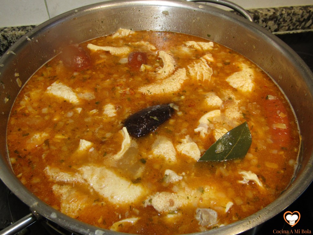 QUINTO.- Una vez recupere el hervor, baja el fuego y remueve de vez en cuando. Tendrá que estar unos veinte minutos aproximadamente hasta que todo quede bien pochado, de forma que cada ingrediente haya aportado su aroma y su sabor, mezclándose todos ellos.