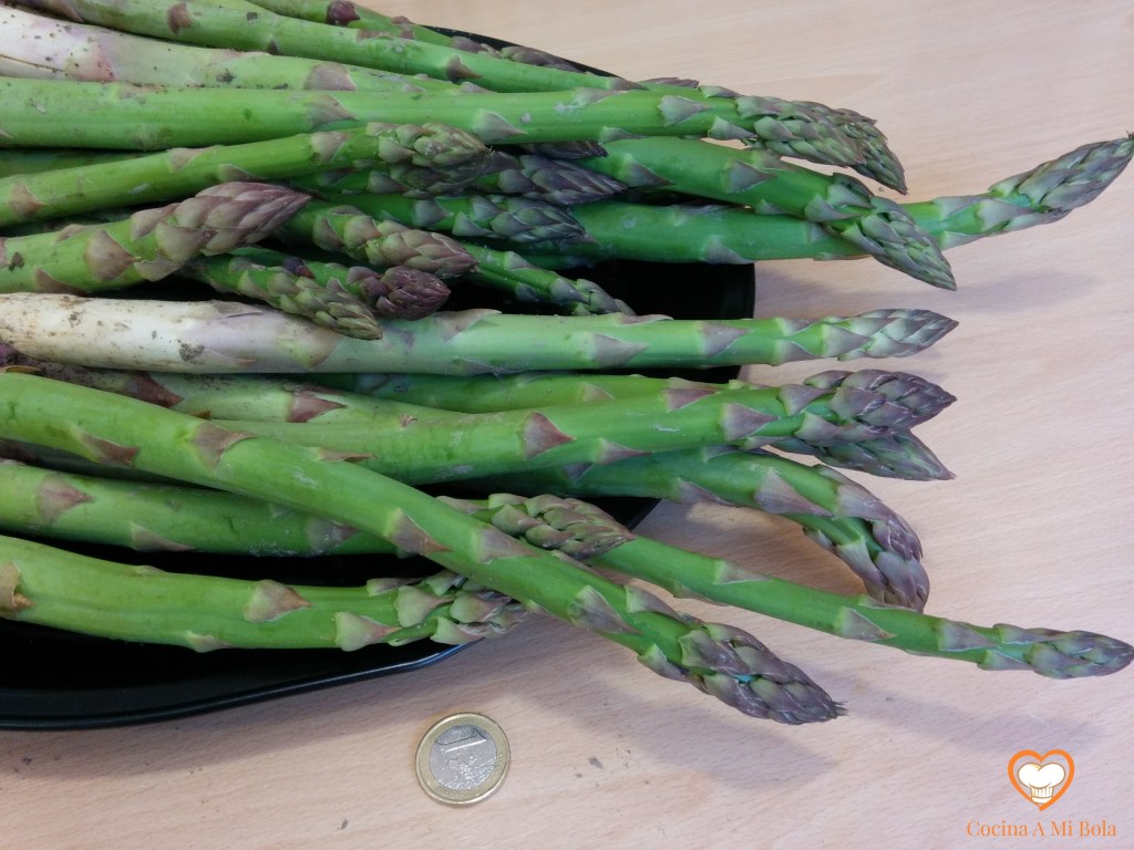 PREVIO.- El cultivo de los espárragos verdes en túneles de plástico, particularmente en Andalucía permite encontrar ejemplares como los que hoy tenemos aquí. Aunque he puesto una moneda de euro en la fotografía siguiente, no sé si se aprecia el tamaño en sus justos términos. Son verdaderamente asombrosos y -afortunadamente- cada vez más fáciles de encontrar. Estos en concreto proceden de un cultivo familiar situado en la alcarreña Villa de Pareja. Esta receta sólo consiste en cocer los espárragos así que me limitaré a decirte cómo puedes hacerlo sin destrozarlos.