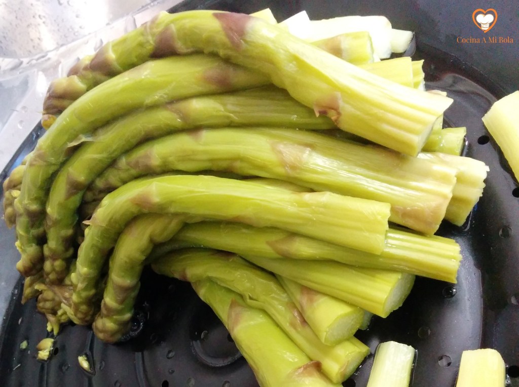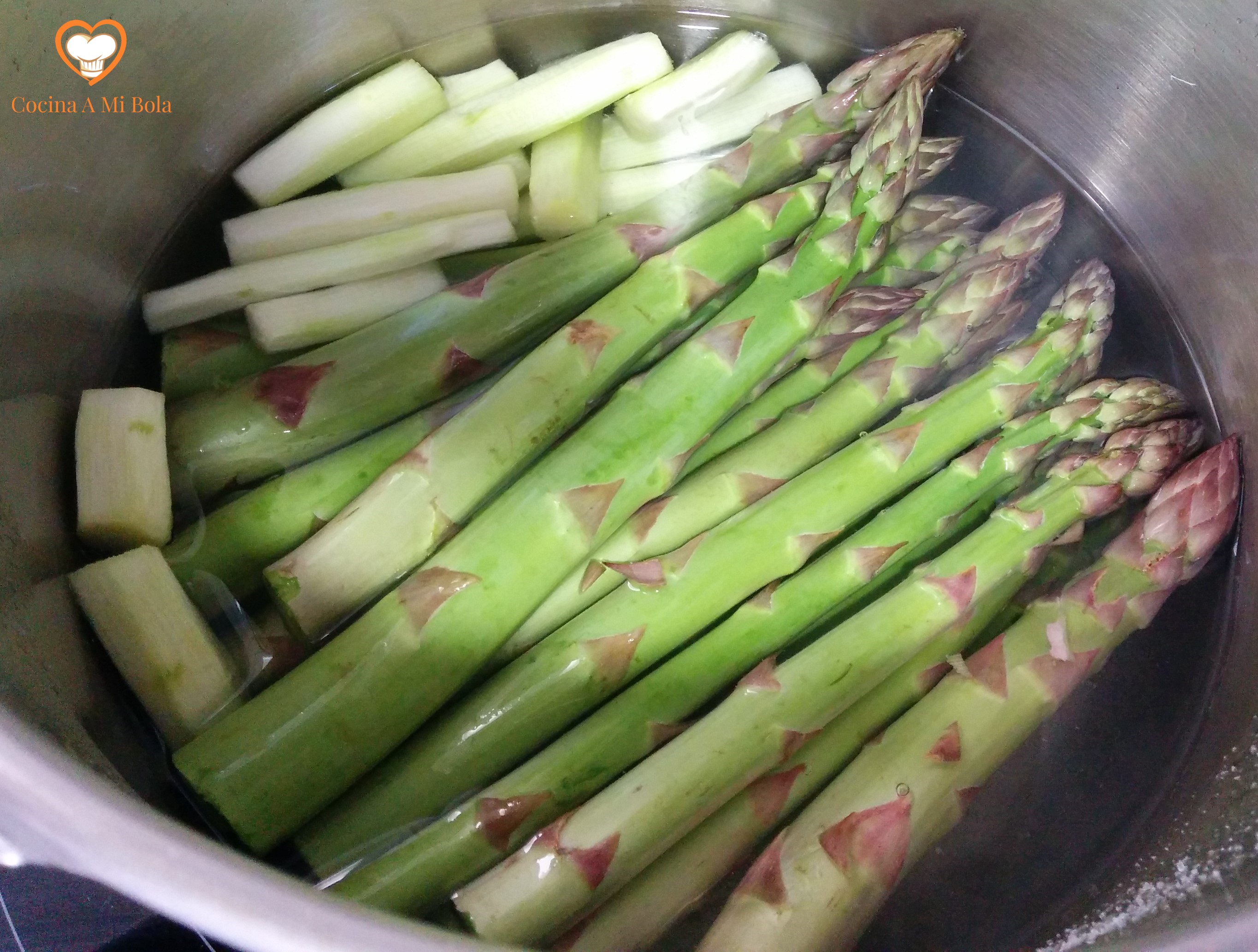 PRIMERO.- Lava bien los espárragos para quitarles la tierra que puedan tener y corta la parte blanca, que desecharemos. Los gruesos como estos son muy fibrosos, por lo que -aun habiendo eliminado la parte blanca- todavía estarán muy duros en su parte inferior. Pero no por eso vamos a desecharlo porque puedes cortarlos todos ellos a una longitud similar y los restos (verdes) podemos pelarlos con un cuchillo, tal y como hacemos con los espárragos blancos, y cocerlos igualmente. Estarán estupendos, aunque algo menos vistosos.