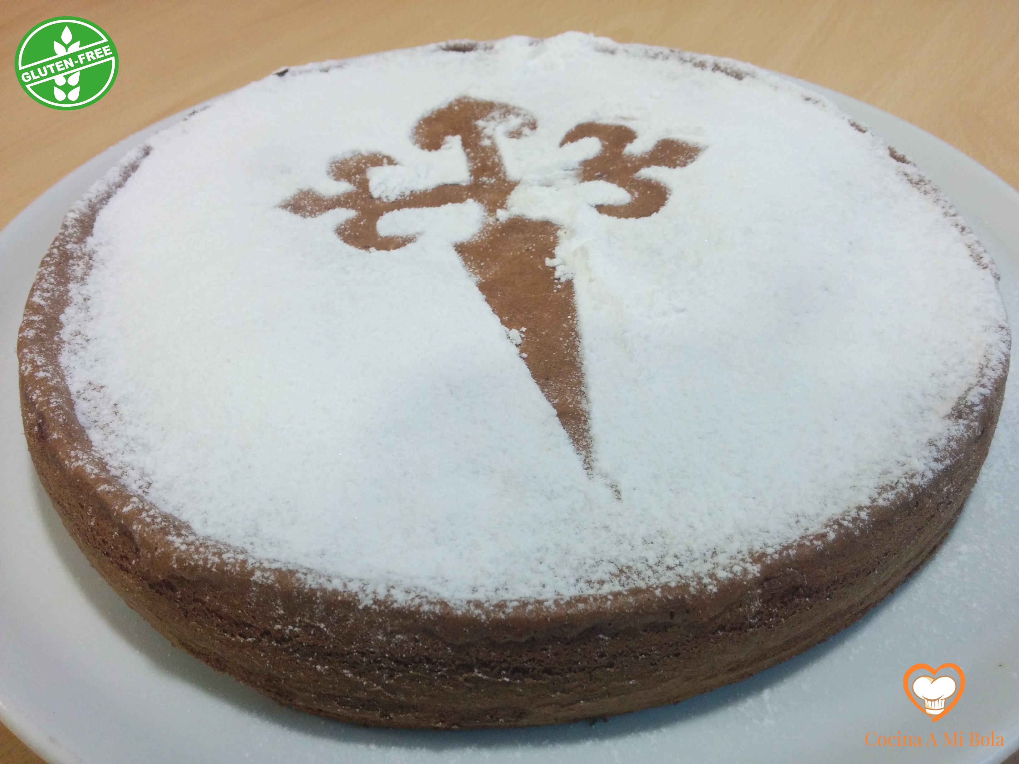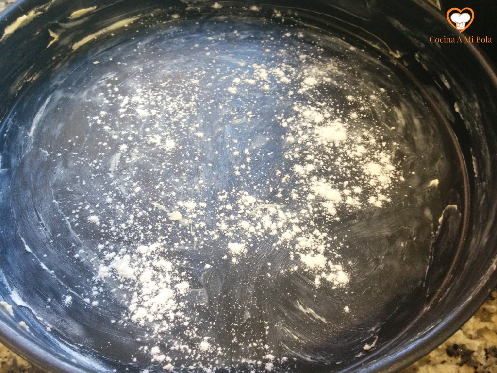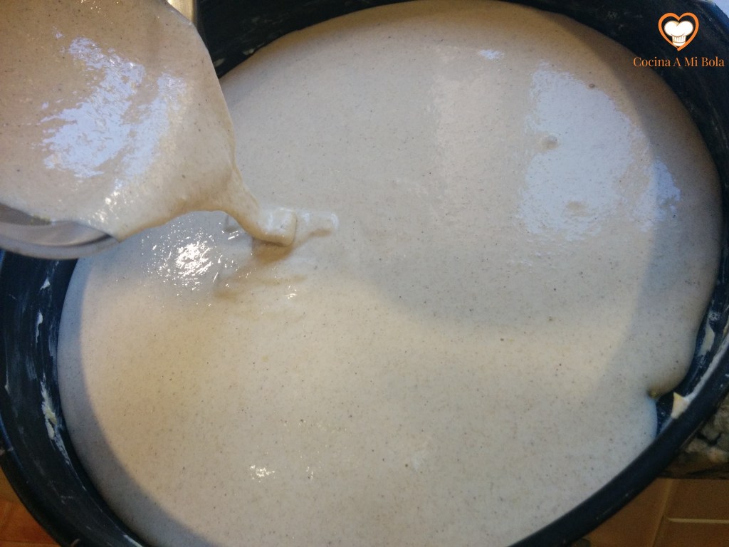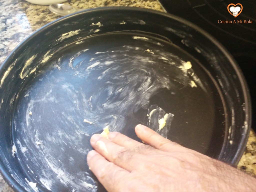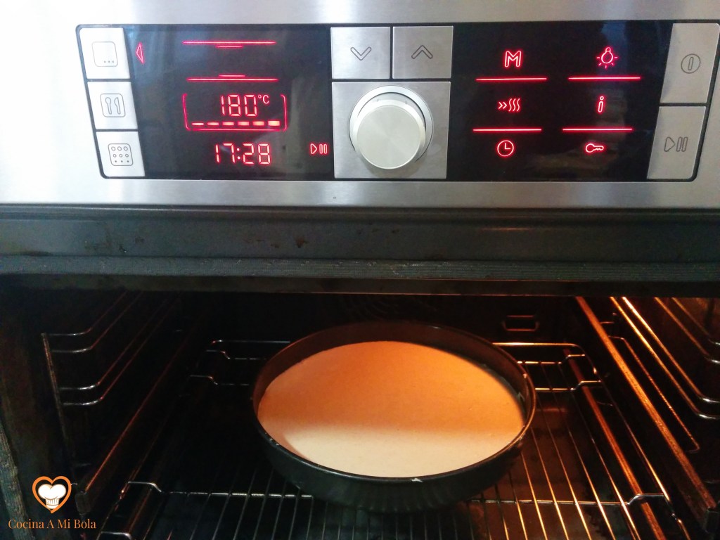 QUINTO.- Échalo sobre un molde redondo y bajo, previamente engrasado con mantequilla y un poco de harina de arroz espolvoreada por encima. Mételo en el horno precalentado a 180ºC, calor arriba y abajo, sin ventilación. Yo calculo que en unos 25 minutos está cuajada la tarta y habrá tomado un tono tostado por el exterior. De todos modos, no te separes mucho tiempo y vigila el aspecto porque no hay dos hornos iguales. En cuanto a la prueba para ver si está ya hecho…. la de siempre: introduce una varilla, aguja o palillo de brocheta por el centro de la tarta y hasta el fondo de forma que, si sale limpia, está ya hecha. Si por el contrario se impregna de la masa, aún le queda. Estate pendiente y no la seques. Sácala del horno y déjala enfriar antes de desmoldar para evitar que se rompa.