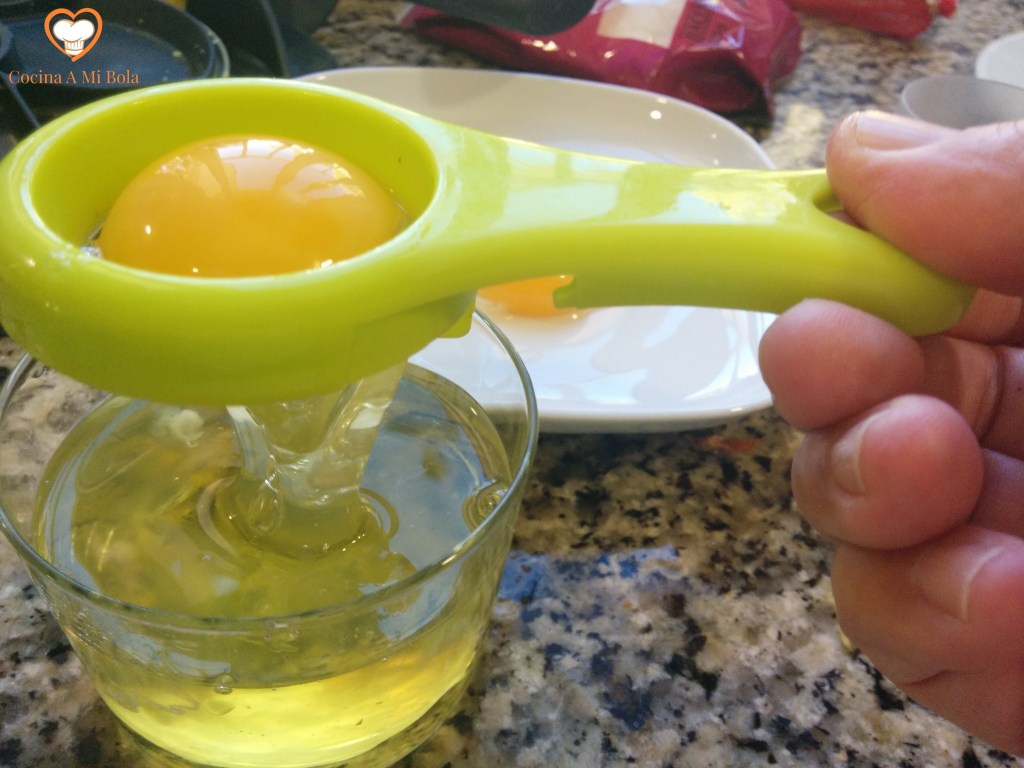 PRIMERO.- Saca los huevos de la nevera un rato antes para que se pongan a temperatura ambiente. Separa las claras de las yemas con ayuda de un utensilio diseñado para ello tal y como ves en la foto o como se ha hecho toda la vida, es decir cascando el huevo por la mitad sobre un recipiente y volcando la yema de una mitad a otra sin que ésta se rompa mientras la clara cae totalmente al recipiente en tres o cuatro vuelcos.