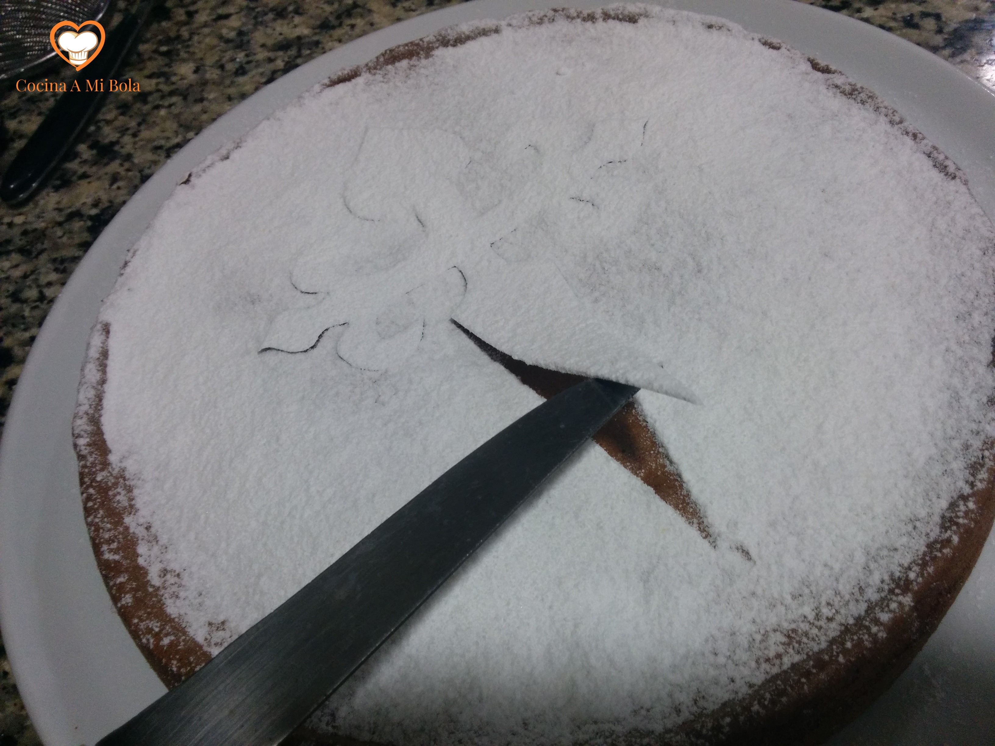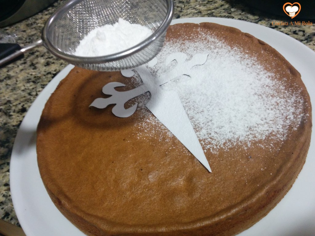 SÉPTIMO.- Coloca la cruz bien centrada sobre la tarta, echa una cucharada de azúcar glass en un colador fino y espolvorea por encima a base de darle pequeños golpes laterales al colador. Una vez cubierta de azúcar glass toda la superficie de la tarta, levanta la plantilla de la cruz con cuidado y ¡listo!.
