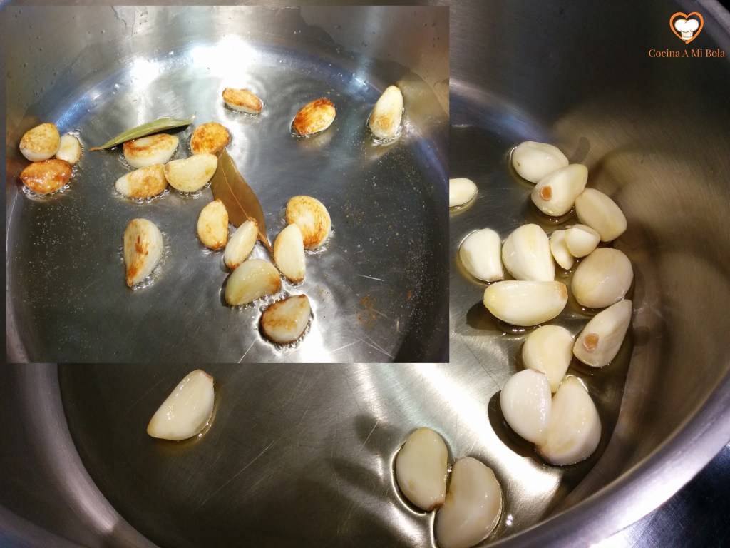 SEGUNDO.- Reservando 5 de los dientes de ajo, pon los demás en aceite de oliva virgen extra y dos hojas de laurel en una cazuela honda. No hace falta que cubra el fondo. Ponlo a baja temperatura para que los ajos se vayan haciendo despacio e impregnen el aceite de su aroma y sabor.