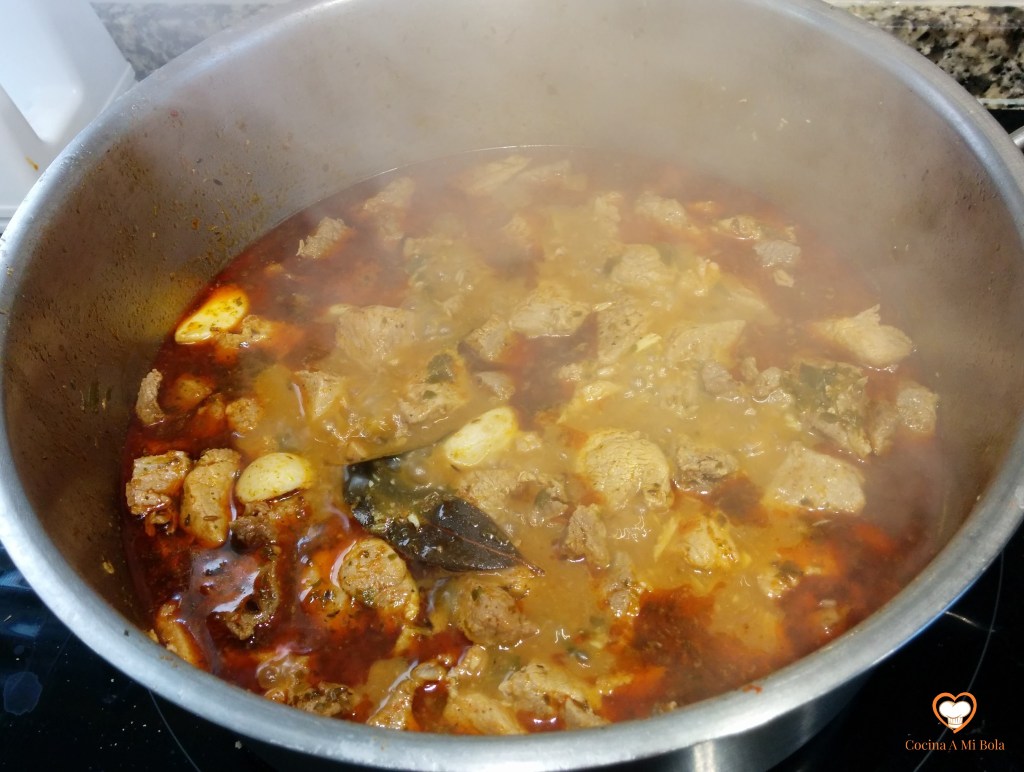 SEXTO.- Echa 300 cc de vinagre de manzana, sube el fuego y remueve bien. Tenlo así otro minuto desde que hierva y añade ahora agua hasta que cubra la carne. Quizá algo menos, es decir, que asome mínimamente por encima del agua. Fuego intenso durante tres minutos y luego lo bajamos al mínimo dejándolo cocer y reducir hasta que la carne esté tierna removiendo de cuando en cuando. Será como media hora a olla abierta. El magro de cerdo hay que tenerlo cociendo hasta que esté blando porque aunque cortes un trozo por la mitad y veas que ya no está crudo por dentro, estará bastante durillo y eso sólo se arregla con tiempo de cocción lenta. Prueba y rectifica de sal.
