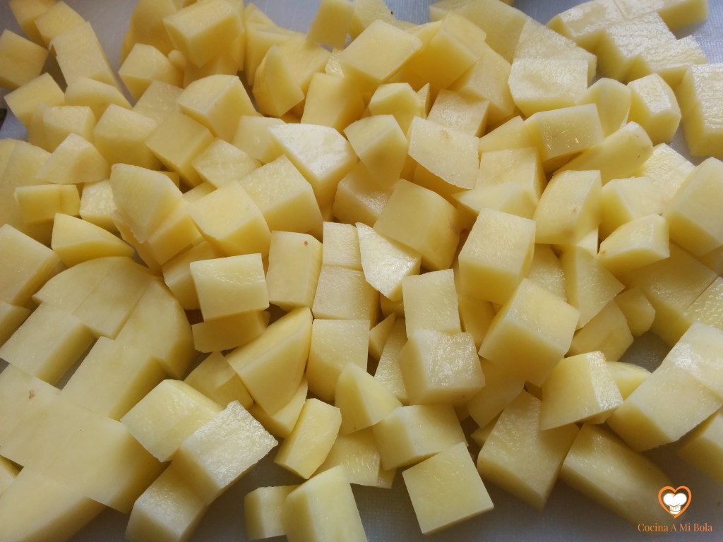 OCTAVO.- Pela una patata mediana por persona,  córtalas en cuadraditos, ponles algo de sal y fríelas en abundante aceite de oliva hasta que estén a tu gusto. A continuación, sácalas de la sartén con una espumadera, escúrrelas bien y pásalas a un plato con papel de cocina.